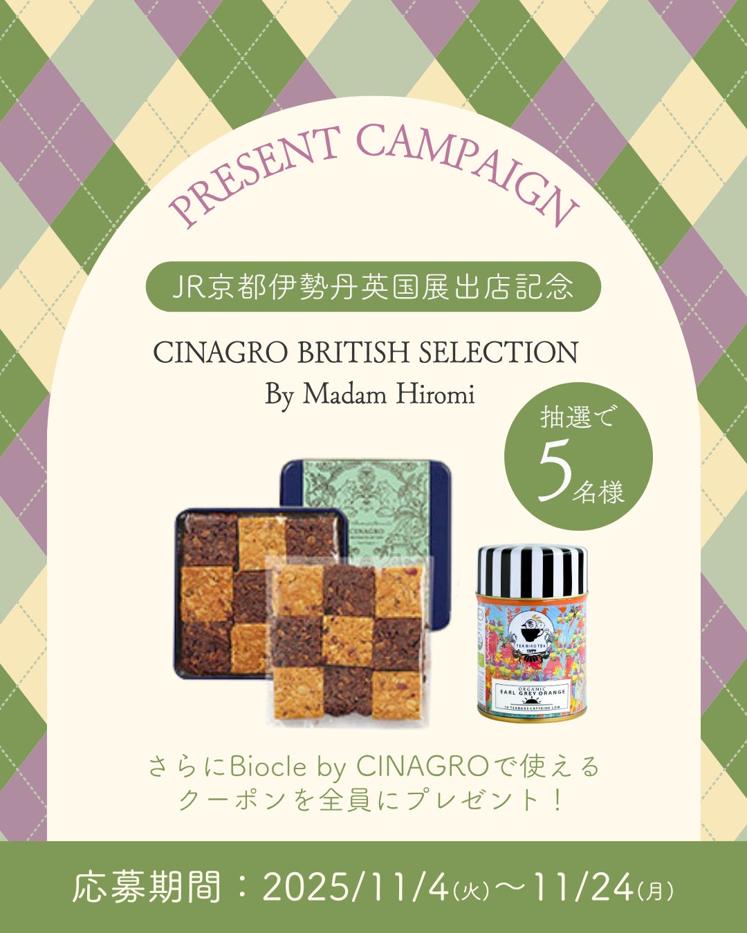 オーガニック食品および健康補助食品の企画・製造・販売・卸を行う薬糧開発株式会社(本社:神奈川県横浜市 代表取締役:河野司)が展開するシナグロ ブリティッシュセレクション by マダムヒロミは、ジェイアール京都伊勢丹「英国展2025」への出店を記念し、Instagramでのプレゼントキャンペーンを実施いたします。