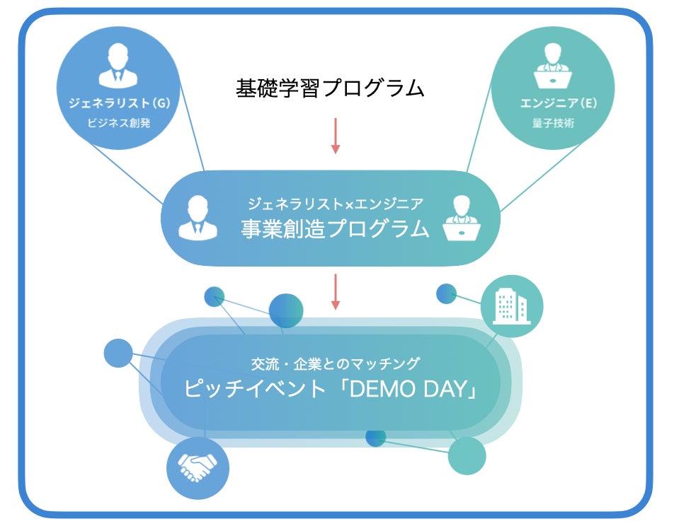 また、事業創造プログラムでは、基礎学習プログラムに参加したジェネラリストとエンジニアから有志を集い、マッチアップからビジネス創発を目指すとともに、ビジネスチャンス創出のためのピッチイベント「DEMO DAY」を実施し、量子産業コミュニティにおける、交流・企業とのマッチングを促進していきます。