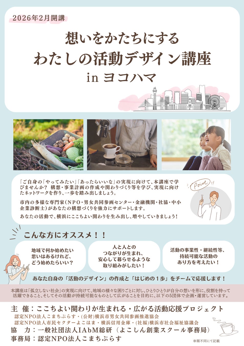 認定NPO法人こまちぷらすと横浜市内の4団体が連携し、自分の「やってみたい」や誰かの「あったらいいな」を叶える応援をする講座を2026年2月より開催いたします。