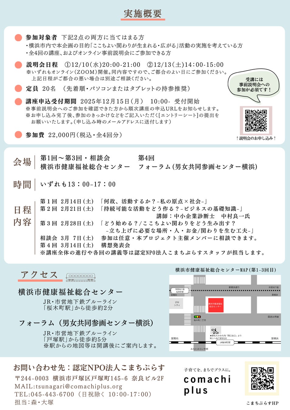 市内の多様な専門家(NPO・男女共同参画センター・金融機関・社協・中小企業診断士)がそれぞれの強みを活かし、参加者の構想づくりを強力にサポートし、横浜市内で「ここちよい関わりが生まれ・広がる活動」の実践者を増やします。