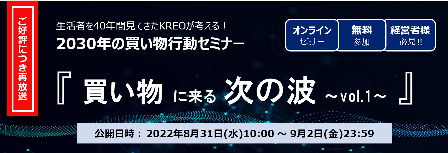 株式会社クレオ(東京都千代田区、代表取締役社長 横井司)は、2021年3月~2022年2月までに2030年の買い物についての無料オンラインセミナー 『買い物に来る 次の波』 を全4回に渡って開催いたしました。ダイジェスト版のセミナーも7月に実施し、累計で700名以上の方に本セミナーにご参加いただきました。今回は、多くの方にご相談や反響を頂いたことと、目先ではなく中長期で未来を捉える視点が重要視されていることから、改めて、全4回のウェビナーを順次再放送いたします。まずはvol.1を8月に放送し、毎月1回ずつ公開を予定しています。今後の生活者動向や、必要になる技術・サービスなどのビジネス発想の起点・取組みのヒントになれば幸いです。