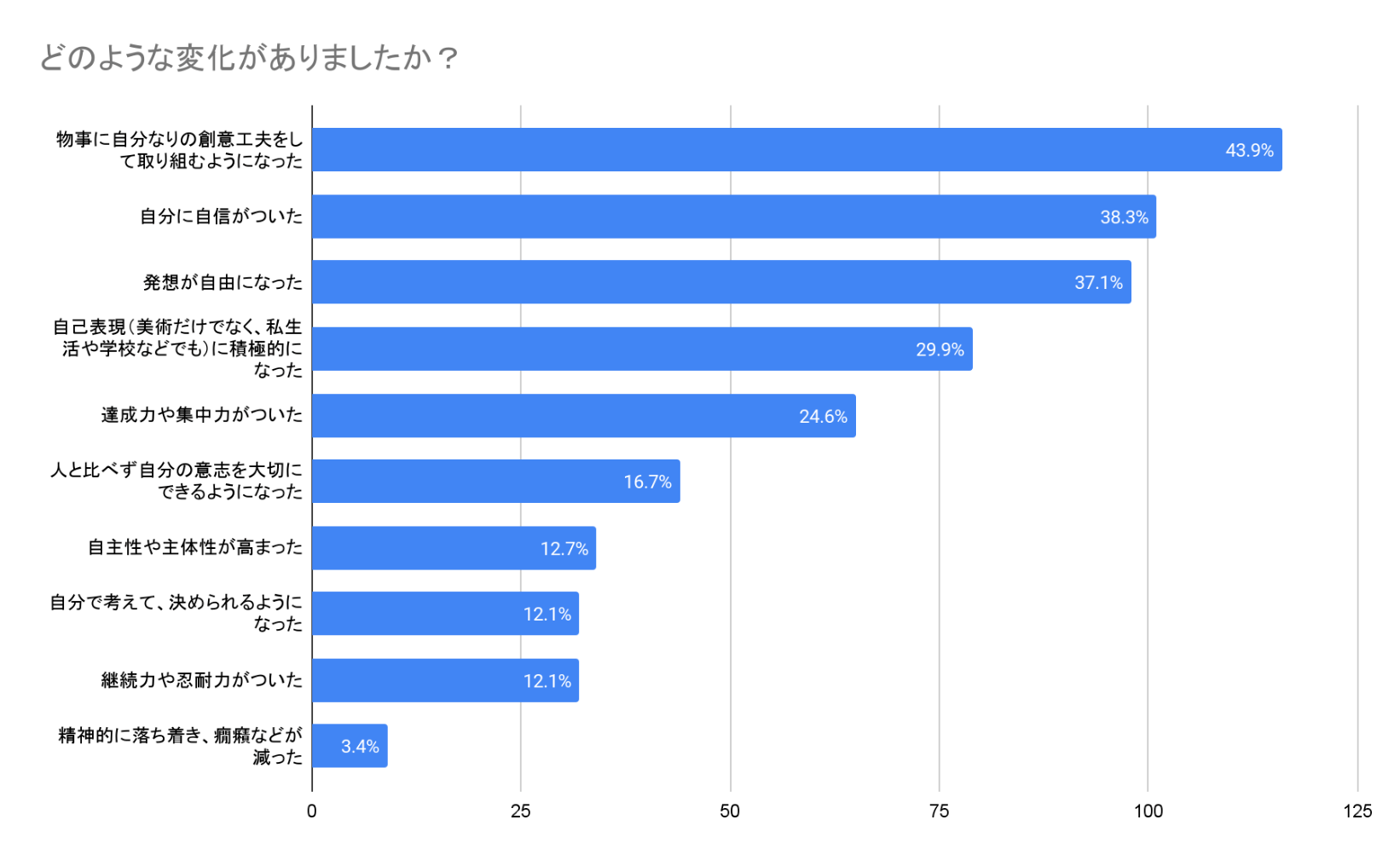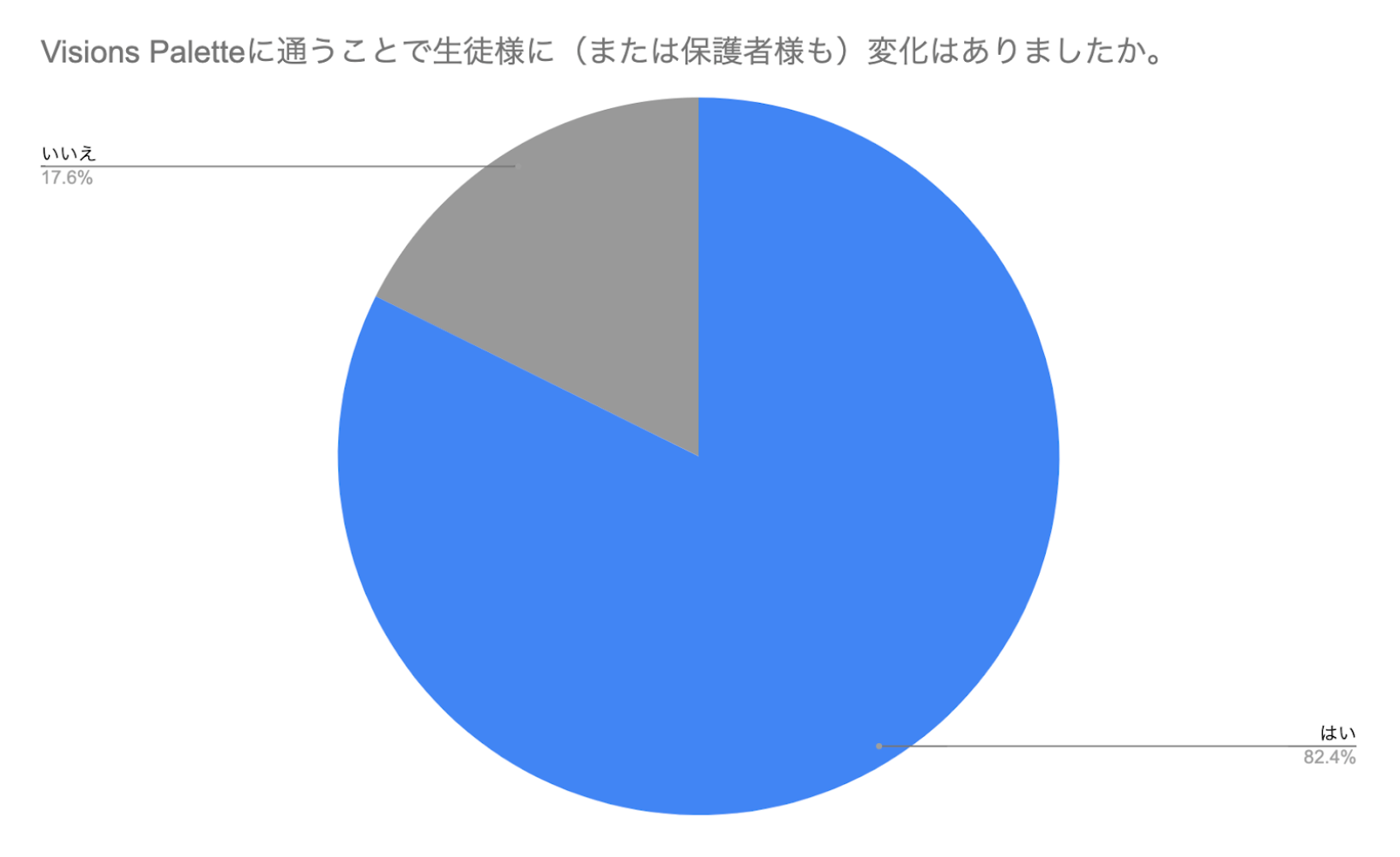 Visions Palette が会員向けに行っている調査によると、「Visions Paletteに通うことで生徒に変化はありました?」という項目では、学芸大学店・三軒茶屋店に通う会員の回答者のうち、82.4%が「はい」と回答。「物事に自分なりの創意工夫をして取り組むようになった」「自分に自信がついた」「発想が自由になった」などの回答が上位を占めました。