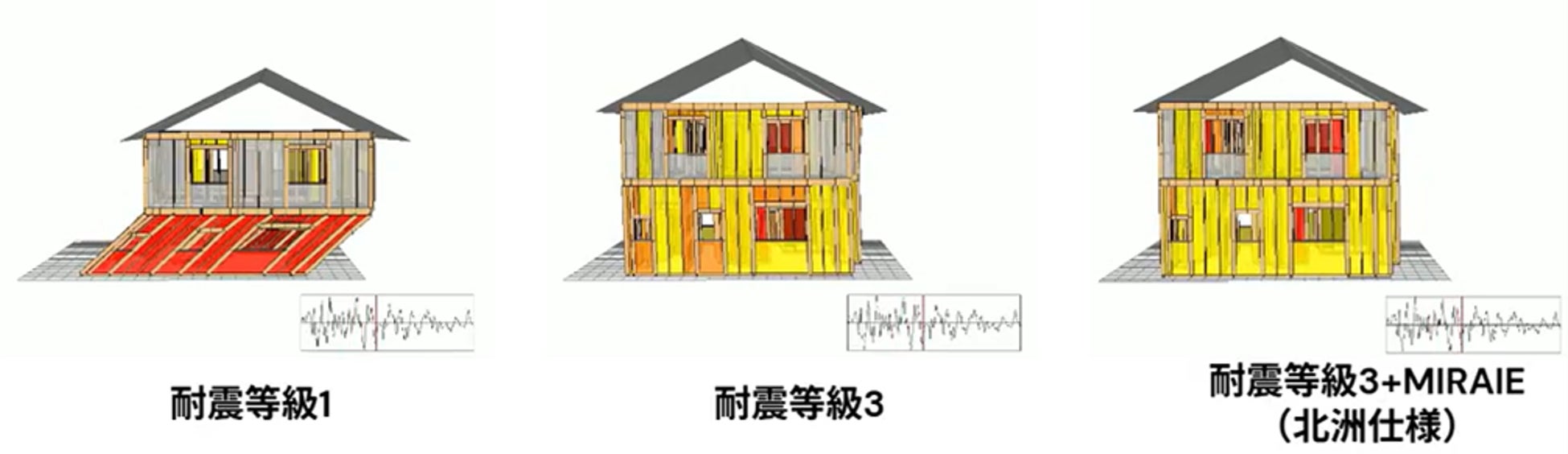 また、物件ごとのシミュレーション以前に、北洲の「サステナブル耐震®」の住宅が繰り返しの地震に強いことを分かりやすく確認いただける動画を作成しました。北洲仕様(サステナブル耐震®)、耐震等級3、耐震等級1の3パターンの住宅に、当社が実施する揺れを加え、比較したシミュレーションの動画です。動画は東日本大震災2回後の極稀地震の揺れから始まり、耐震等級1が地震直後に大破して居住不能、耐震等級3も住み続けるのが危険な状態となった一方で、北洲仕様の家は全ての揺れを経ても居住者の生命を守れる耐力を有する、高い性能を示す結果をご覧いただけます。