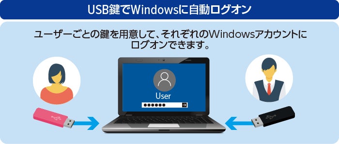 ユーザーごとにUSB鍵を用意して、Windowsユーザーに関連付けることで、鍵を装着するだけでWindowsに自動ログオン(サインイン)することができます。