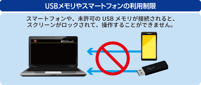 利用者(USB HardLockerの管理者以外)に対してストレージの利用制限を設定することができます。利用者が『許可されていないストレージを接続すると、自動的にスクリーンロックがかかり、操作が一切できなくなります。そのストレージ を取り外すと、スクリーンロックが解除されます。
