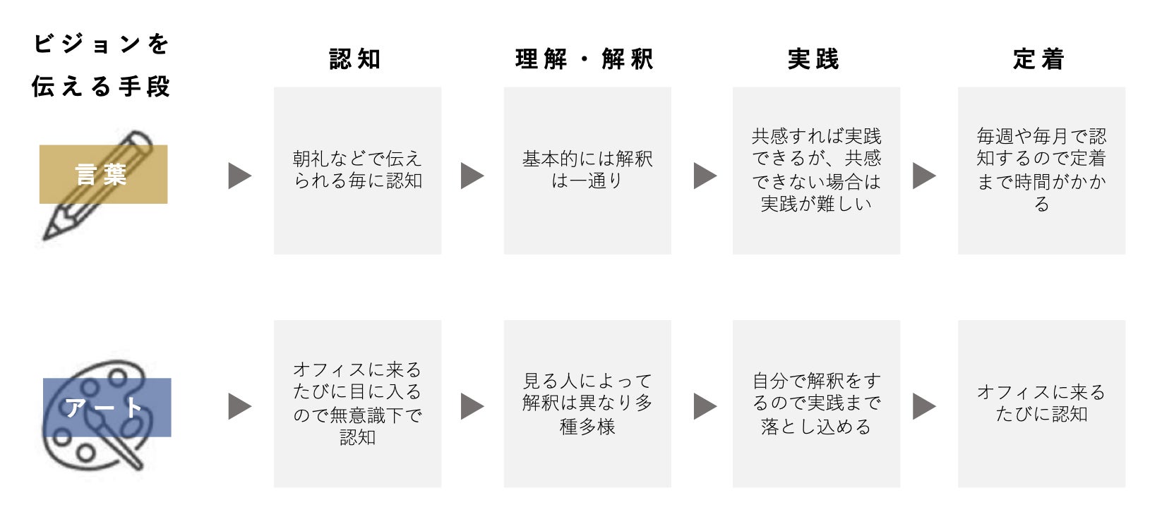 アートはビジョン浸透においても良い働きをします。人が大きなビジョンを共に志す には、言葉による共有よりもアートによる共有の方が効果的な場合があります。