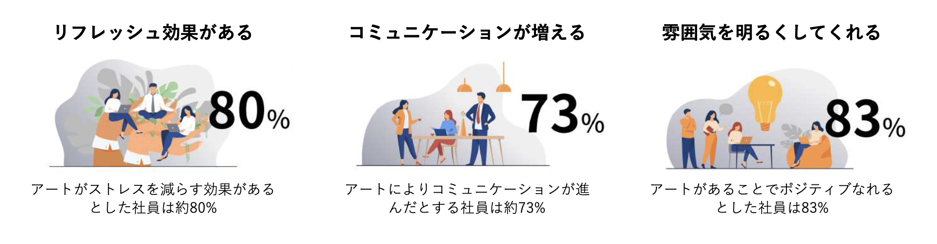 オフィスにおけるアートには、顕在的な効果と潜在的な効果が認められます。実績後のアンケートの結果、以下のようなことがわかりました。