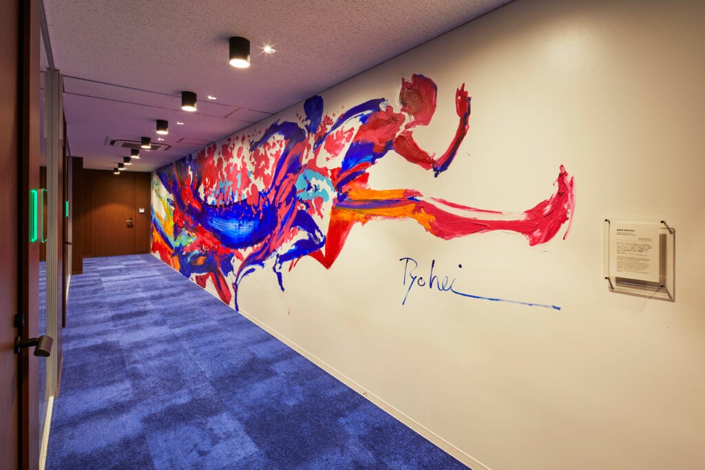 Details:オフィスのリニューアルに伴い、長い廊下を活かしてシンボルアートを導入。 ウォールアート制作にあたっては、社員の皆様とセンスシェアリングワークショップを行いコンセプトをまとめるところからスタート。 その後の制作に至るまで、山下さん指揮のもとさまざまな社員様が筆をとり、実際に壁に描くところまで一緒に遂行しました。