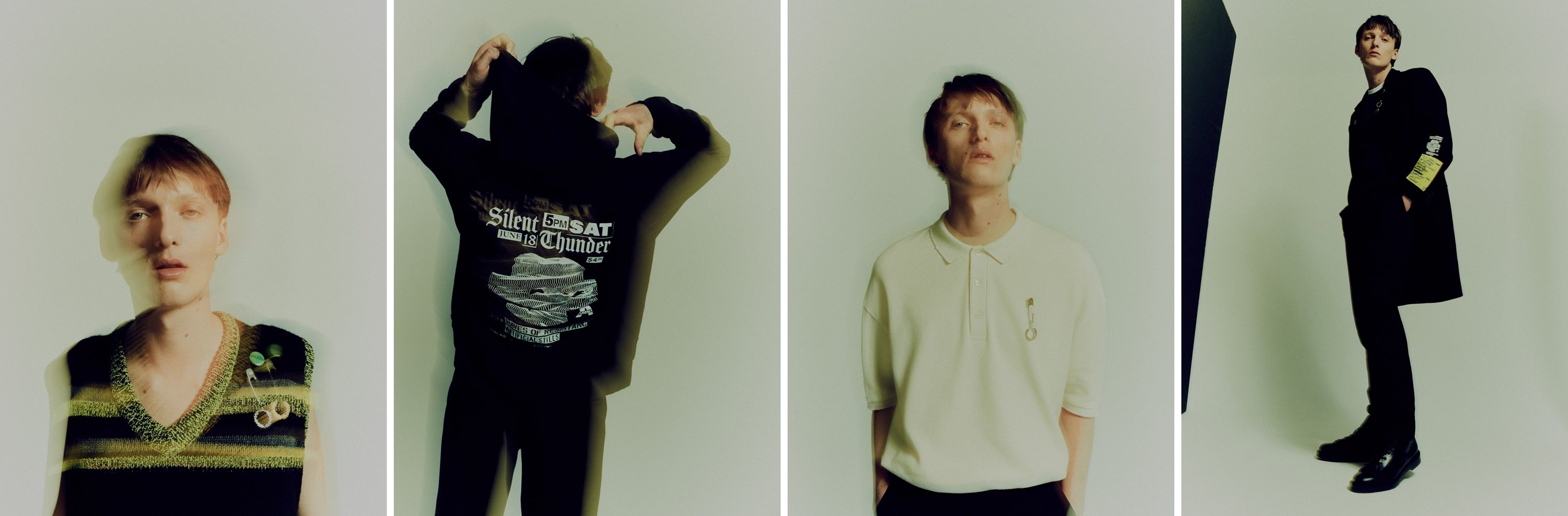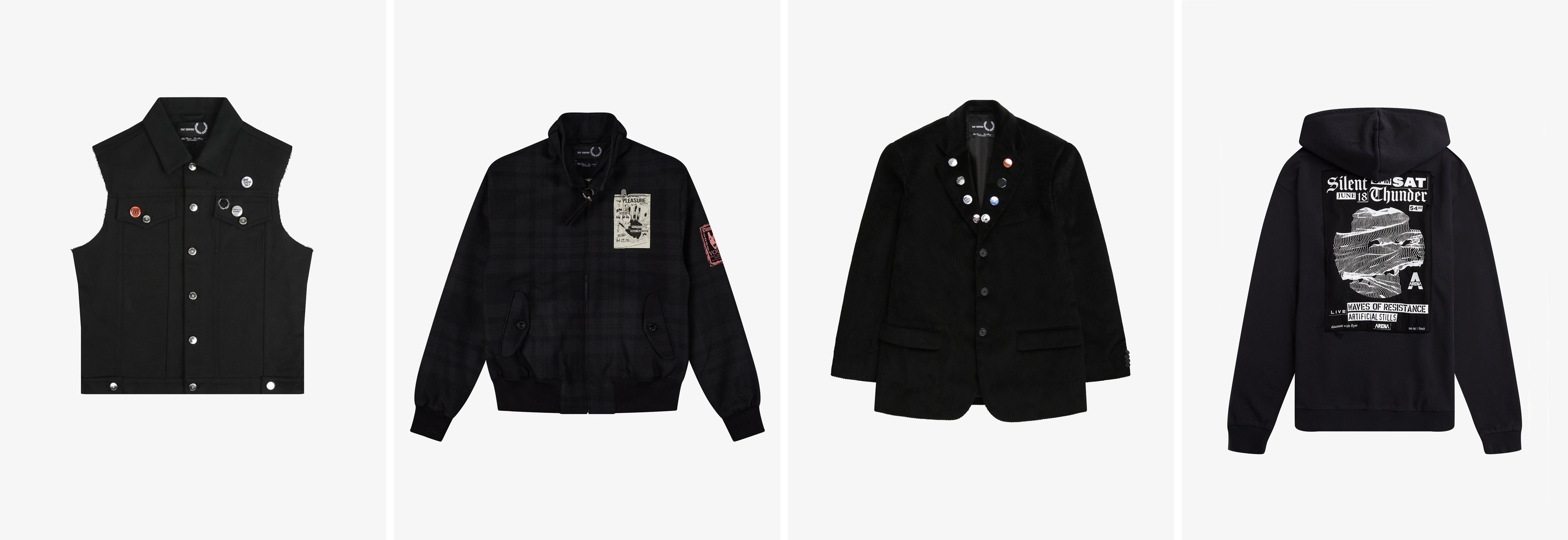 今シーズンは、音楽シーンと音楽に関するコレクターズアイテムから影響を受けています。Raf Simonsはフレッドペリーのクラシックなアイテムに自身の名を冠したオリジナルコレクションの感性を注入し、彼の長年のコラボレーターであるグラフィック・アーティストTom Tosseyn(トム・トッセン)によるユニークなアートワークでウェアを装飾しました。このアートワークは、青春時代の儚さ、当時属していたサブカルチャー、他人にとっては無意味で簡単に捨てられてしまうような自分だけの宝物だったライブのポスターやフライヤー、バッジの収集など、ユース時代の記憶がデザインベースとなり、「Special Guest」「An Evening With」「One Show Only」など、セットリストにあったフレーズが採用されました。
