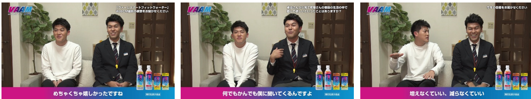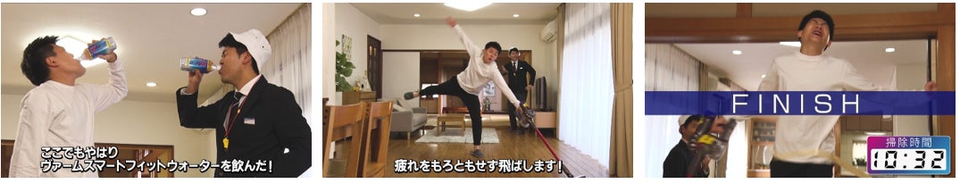 本動画ではそんな家事を競技に見立て、弟・有輝さんが選手としてタイムレースに挑みます。審判を務めるのは兄の卓也さんです。カラダを動かす人をサポートする「ヴァームスマートフィットウォーター」を、タイムレース前や最中に飲んでやる気を出し、ダイナミックな動きをしたり、競技を終えた後の嬉しそうな表情を浮かべたりする有輝さんや、競技中の審判・卓也さんの表情にもご注目ください。