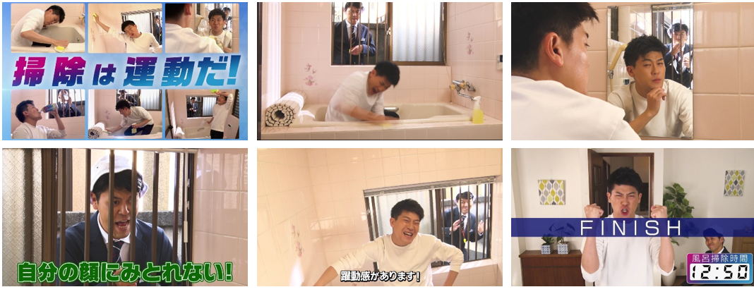 続いて有輝選手が挑戦するのは、風呂掃除のタイムレースです。ここでもカラダを動かす前に「ヴァームスマートフィットウォーター」を飲んでやる気を出します。途中、鏡に映る自分の顔にうっとりしてしまいタイムロスをしてしまった有輝選手。少し気恥しそうな表情を浮かべながらも競技を続けます。見事な身のこなしで楽しそうに腰を振りながら掃除をしていき、ゴール。自信に満ちた表情を浮かべました。