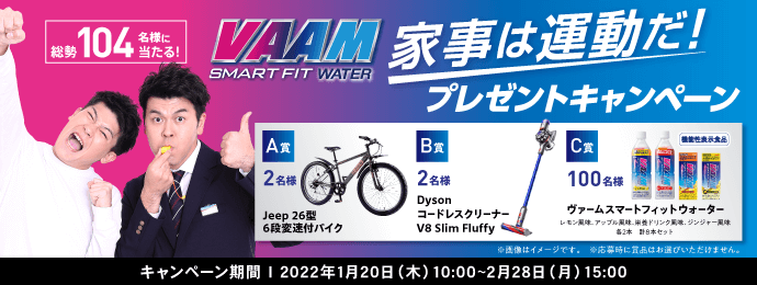 VAAM Twitter公式アカウント(@vaam_official)をフォローし、期間中毎日投稿される対象のツイートをリツイートした方から抽選で合計104名様に豪華賞品をプレゼントいたします。毎日1回の応募が可能です。