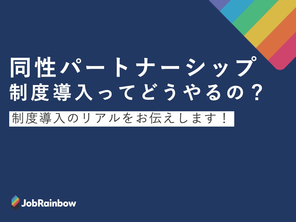 株式会社JobRainbow(本社:東京都渋谷区、代表取締役:星賢人)は、企業で同性パートナーシップ制度を導入する際の基礎的な手順や注意点を紹介する無料オンラインセミナー「同性パートナーシップ制度導入ってどうやるの?制度導入のリアルをお伝えします!(https://cherry-thunbergia-f0d.notion.site/0059af2b29a64d348aed193c0f3ff486)」を2022年1月25日に開催致します。