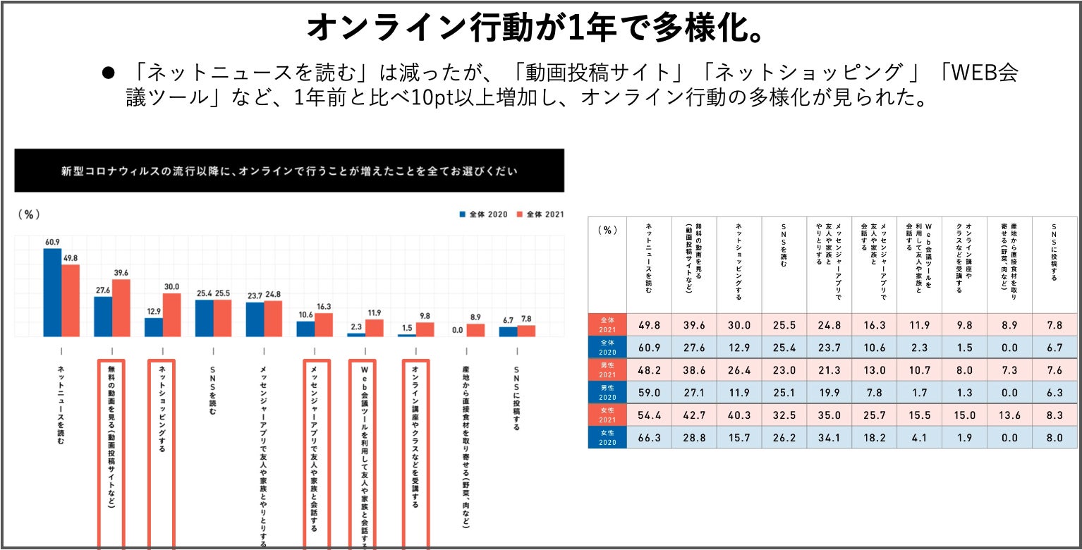 昨今、新型コロナウィルス感染症により、行政手続きや、医療分野などにおけるデジタル化が注目されたこと、ビデオ通話による交流を契機に、シニア世代のデジタル意識は大きく変化しました。実際に趣味人倶楽部で実施した調査結果でも、コロナ前後でシニア世代のオンライン行動がかなり多様化し、活発になっていることが明らかになっています。