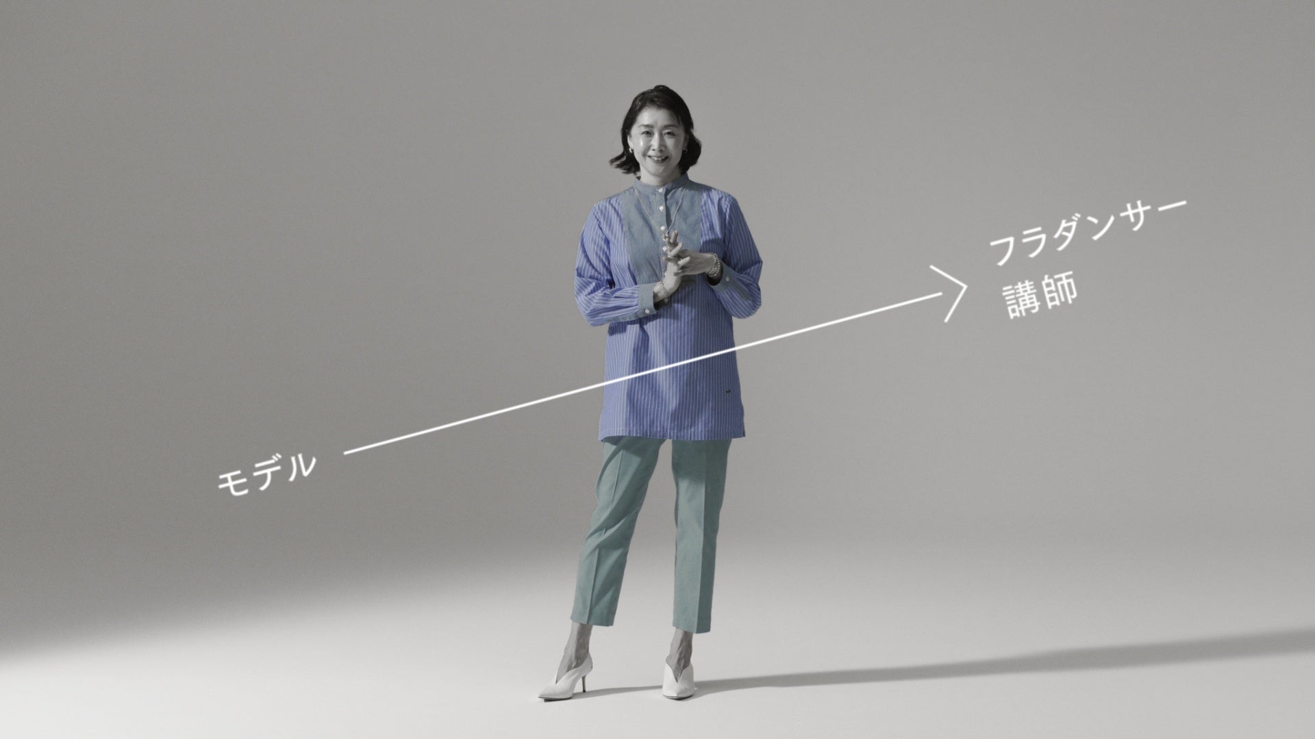 服はモノクロの世界に浮かぶカラーと動きだけで表現し、最後にブランドロゴを見せ、出演者を通じてスタ
