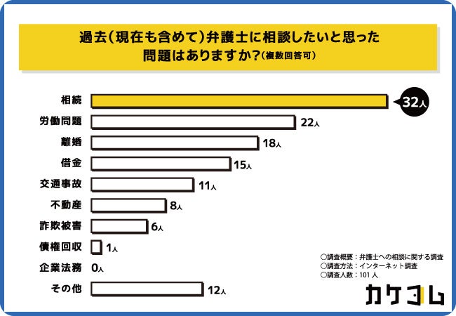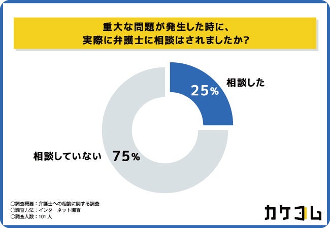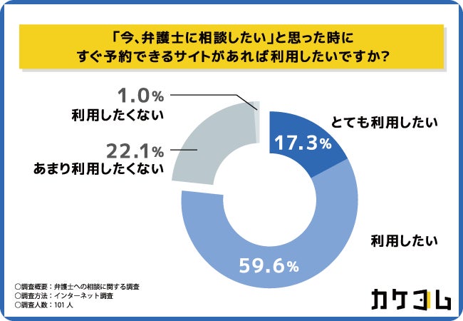 そこで今回、弁護士予約サービス『カケコム』(https://www.kakekomu.com/)を運営する株式会社カケコムは、全国20〜60代以上の男女101名を対象に「弁護士への相談」に関するアンケートを実施しました。