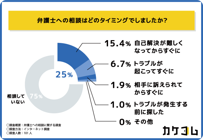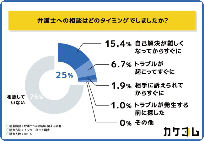 以上、弁護士に相談した経験がある方は『25%』で、自己解決が難しくなってからすぐに探した方が『15.4%』と判明しました。