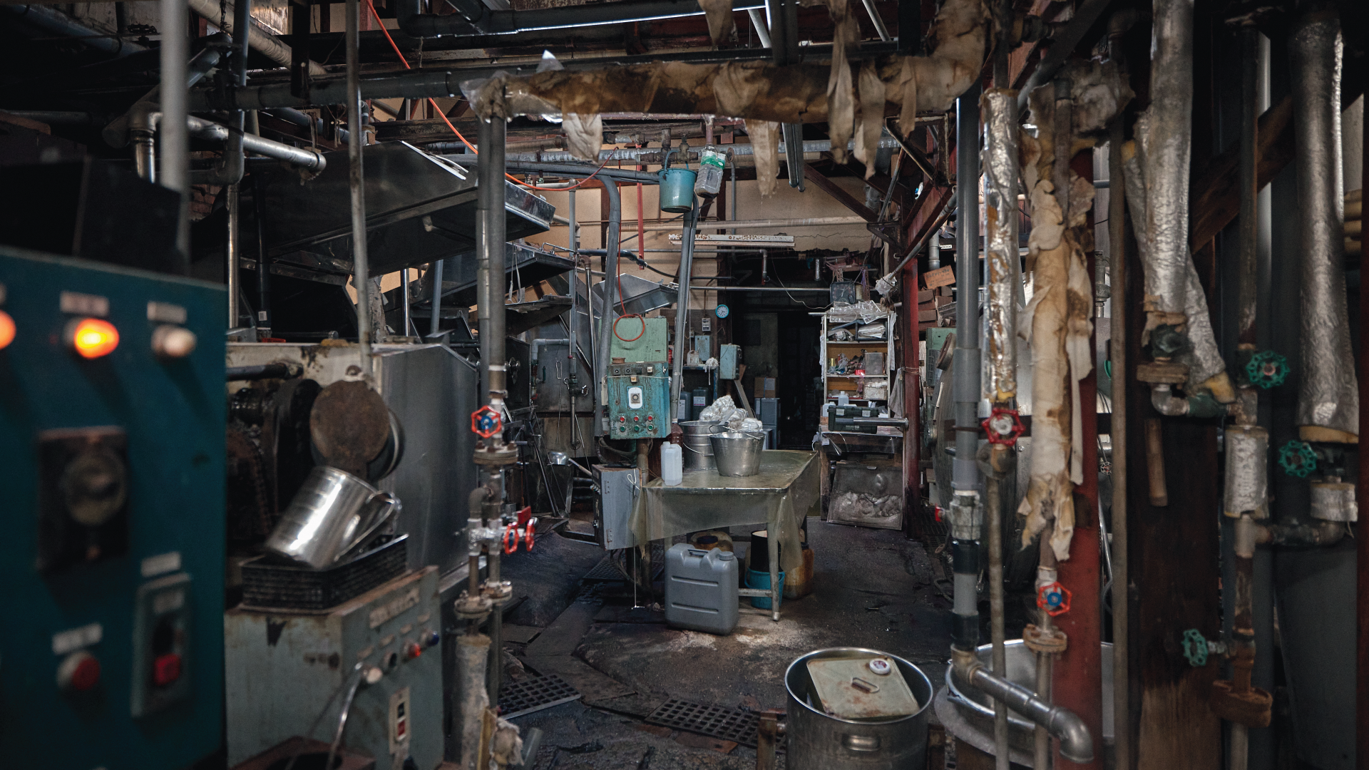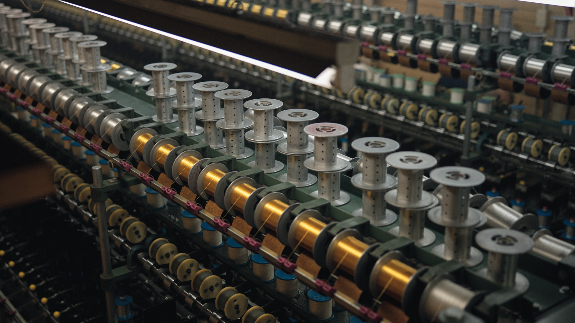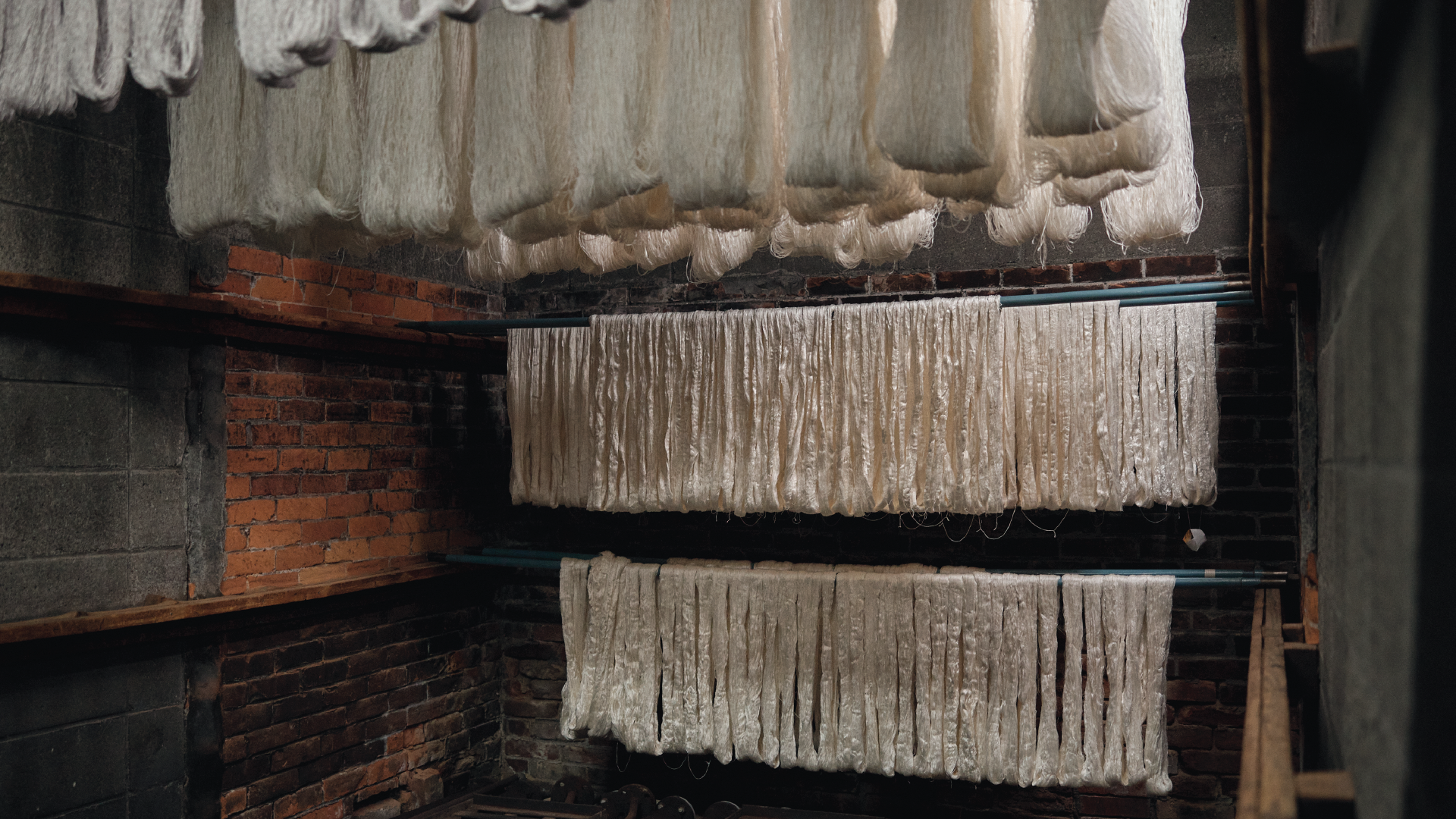 絹でできた芸術品のような帯。それは染料を煮詰めた鉄の釜と、自動車工場にあるような油を塗った機器から生まれていたのです。帯の一本一本の糸は、一度は工場内の空気の中を漂い、その後すぐに想像を絶する圧力で粉砕され、織物工場に送られます。