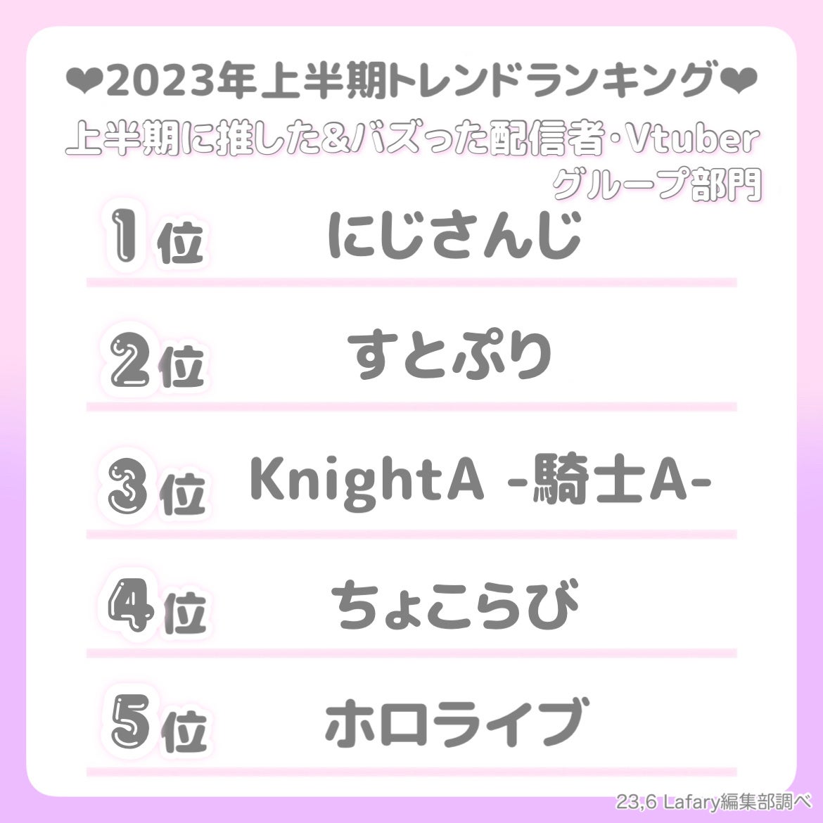 人気VTuberグループの「にじさんじ」が圧倒的な人気で1位にランクイン。全152名ものVTuberが所属しており、国内外に多くの視聴者を抱えています。「量産型」「地雷系」のユーザーからは、所属メンバーの中でも特に男性VTuberの名前が多く回答にあがりました。今年に入ってからも既に新人ライバー15名がデビューしており、ますます大きな話題を生みそうです。