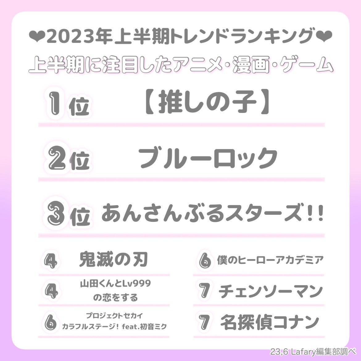 TOP10にはジャンプやマガジンといった少年漫画作品が多くランクインしました。2022年から2023年にTVアニメが放送された、今勢いに乗っている作品が目立ちます。また、「ブルーロック」や「僕のヒーローアカデミア」などアニメの続編が決定している作品もランクインしており、これからますます注目度が高まっていきそうです。