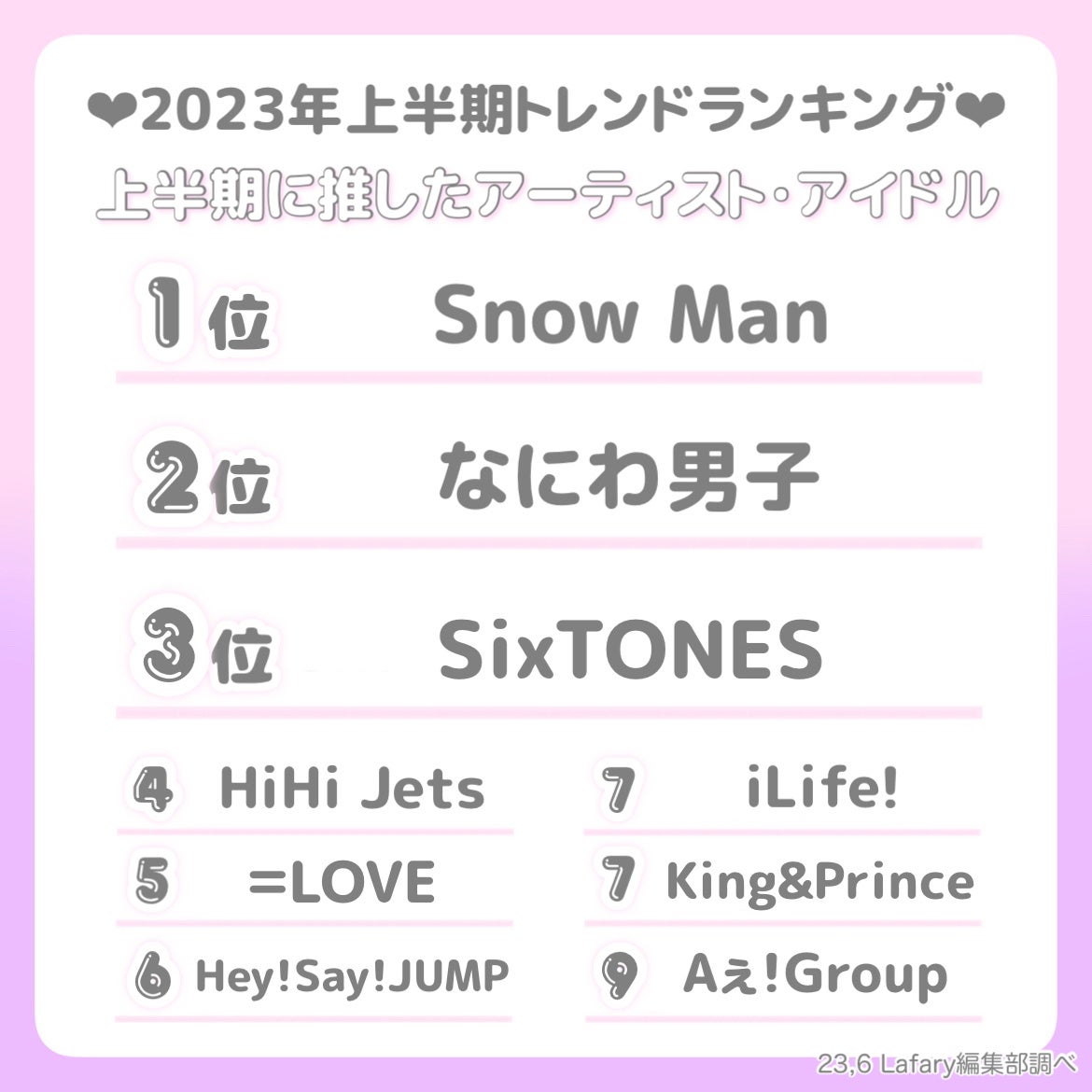1位はジャニーズ事務所所属の「Snow Man」。2012年に結成、2020年にデビューしたダンスやアクロバットを得意とするグループです。各メンバーが舞台やバラエティなどで個々の個性を活かして活躍しており、グループとしてもその人気を益々伸ばしています。第37回日本ゴールドディスク大賞では「アーティスト・オブ・ザ・イヤー賞」などの計7賞を受賞し、7冠を達成しました。今年5月26日から7月2日にかけては、初のドームツアー『Snow Man 1st DOME tour i DO ME』を開催しており、アーティストとしての活動にも注目が集まっています。