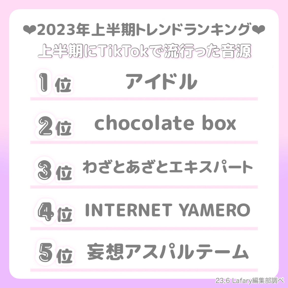 一億円Pが2015年に公開したボカロ曲「chocolate box」が2位に。8年前の楽曲ですが、2023年に入ってからこの曲に合わせて2人で踊るダンス動画が流行しています。左右に揺れる真似しやすい振り付けで、顔を隠して服や体型を魅せる投稿も多くアップされています。