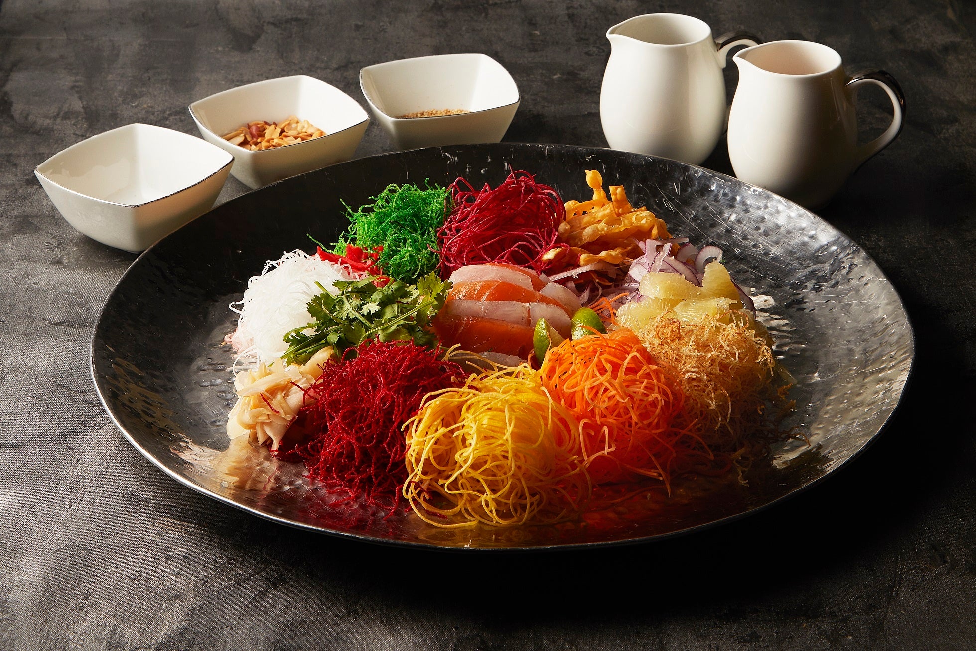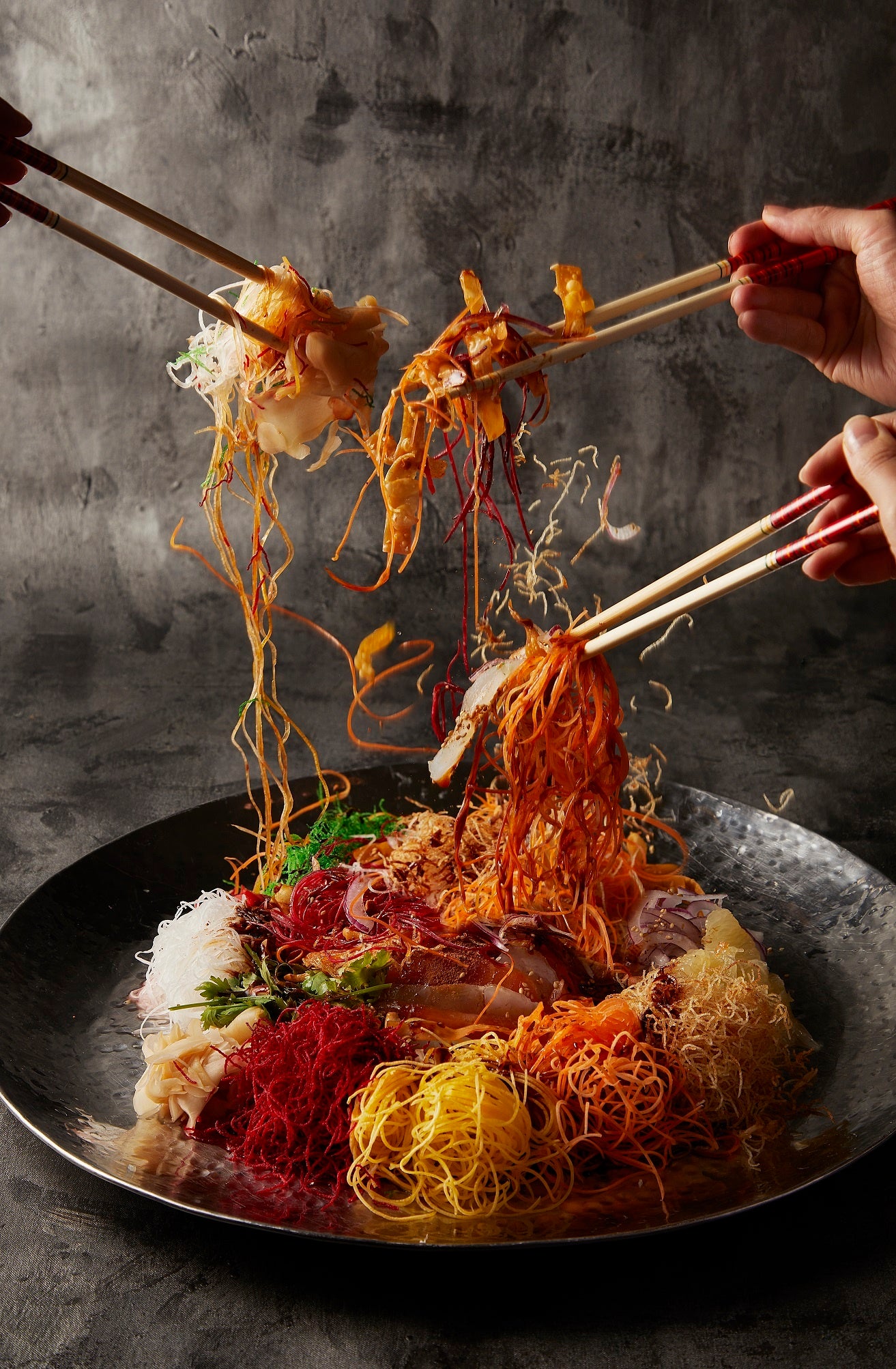 シンガポールやマレーシアでは旧正月伝統料理「イーサン」を、家族や友人たちと一緒に願い事をしながら、お箸で具材を高く持ち上げ、混ぜ合わせながらソースや薬味とともに食べるにぎやかな文化があります。幸運の象徴である赤色はにんじん、商売繁盛を意味する白色は玉ねぎと生姜、長寿を願う緑色のパクチーに、お金を表す縁起物の揚げワンタンなど、ひとつひとつの具材やソースにいたるまで幸運を呼び込む願掛けがされています。