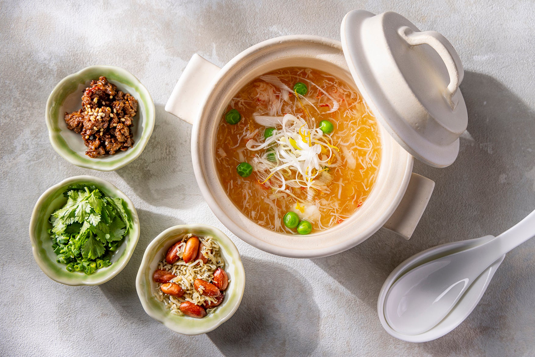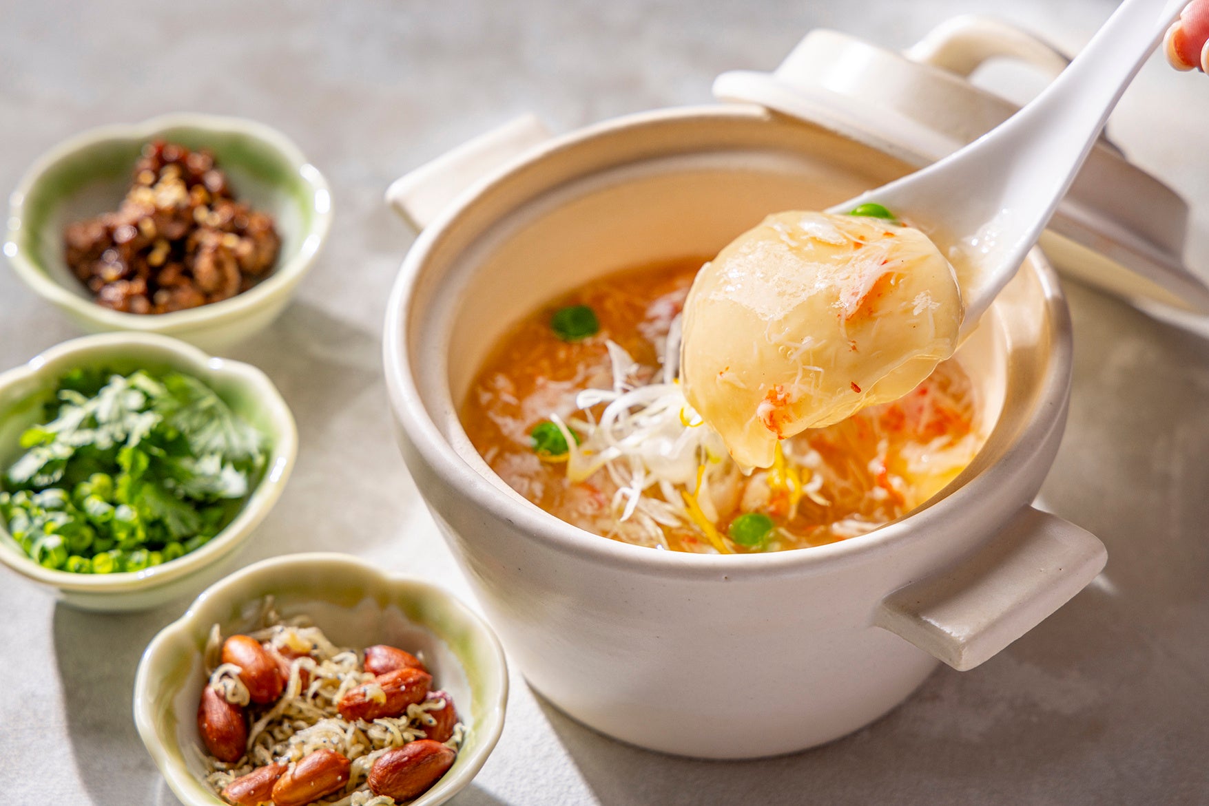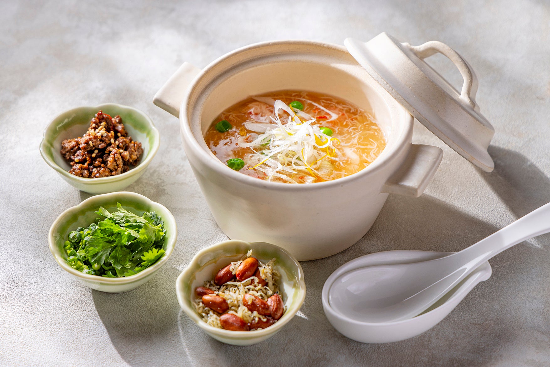 また、選べる朝食のメインとして、2月29日(木)まで提供される「中華風茶わん蒸し」も旧正月時期に合わせて新登場するアジアンメニューです。具材と一緒に蒸し上げる日本の茶わん蒸しとは違い、中華だしたっぷりの卵液を蒸したあとにカニやグリーンピース、白ネギをトッピング。さらに、添えられたゴマ入りのピリ辛肉みそや、パクチーとネギ、香ばしく炒めたじゃこピーナツをお好みで合わせて、次々に変化する食感や味をお楽しみいただけます。優しい口当たりで、身体の芯から温まる寒い季節にぴったりな期間限定の朝食メニューをぜひご賞味ください。