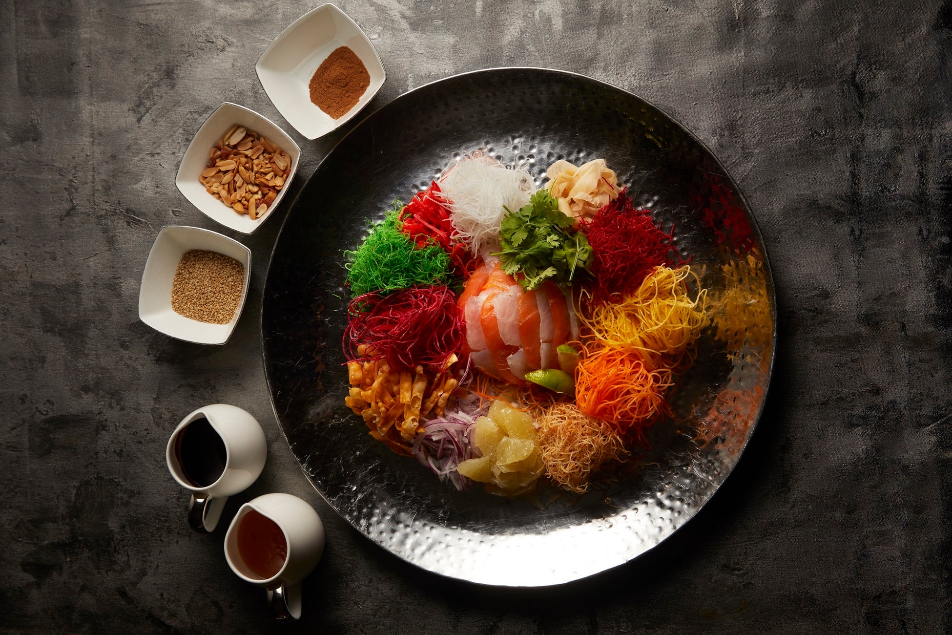 2024年の旧正月は2月10日。「ローヘイ(撈起)」という掛け声とともに、商売繁盛、健康長寿、さまざまな願いを新しい1年に込めて、真鯛やサーモン、コリアンダー、玉ねぎ、にんじんなど色とりどりの具と、ピーナッツ、中華料理に欠かせないスパイス五香粉や広東風甘みその海鮮醤油が混ざる東南アジアのエキゾチックな味をご堪能ください。