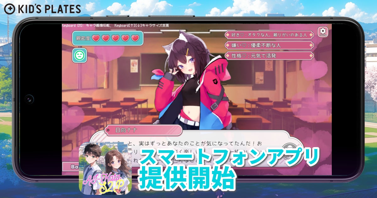 株式会社キッズプレートは、これまでPC版で好評を博してきた「AI-KATA S2P ♡(ラブ)バージョン」を、より多くのユーザーに楽しんでいただけるよう、スマートフォン版をリリースいたします。今回のリリースにより、ユーザーはいつでもどこでも手軽にAIとの恋愛シミュレーションを楽しむことができます。キャラクターとの親密度が上がるにつれて会話が変化し、より深く感情移入できる体験を提供します。