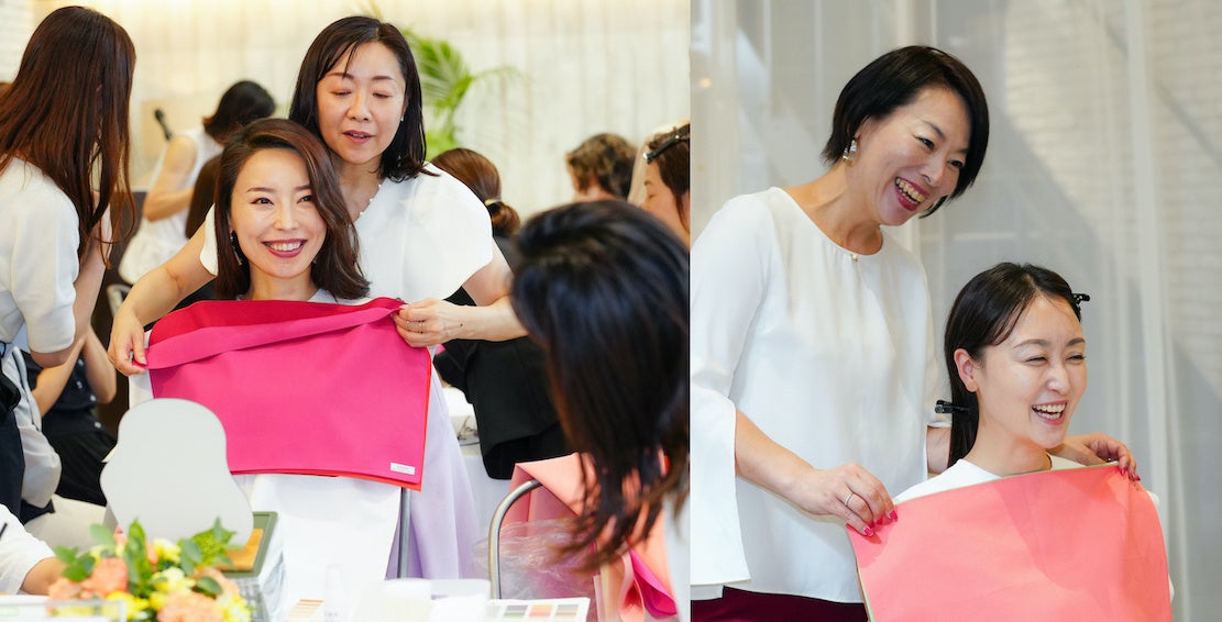 その後、イベント参加者全員に「パーソナルカラー診断体験」を実施。サロンスタッフ様が、それぞれのお客様を診断し、似合った色をアドバイス頂きました。ご自身に似合う色を知ることは意外な発見もあるようで、お客様も笑顔で溢れました。