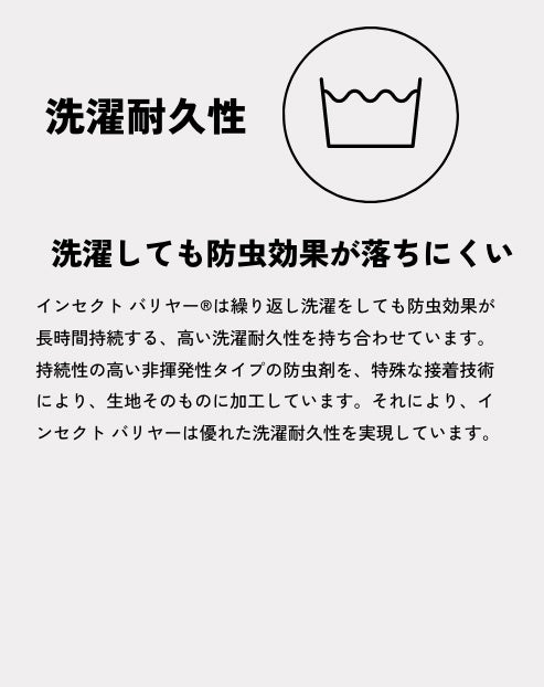 「インセクト バリヤー®」シリーズは、虫が生地表面に触れた際に“留まりにくい状況” をつくり出す、接触忌避剤を施した防虫ウェアシリーズです。使用されているのは、天然の除虫菊に似た成分構造を持つ「ペルメトリン」。肌にも優しく、安心して着用いただけます。