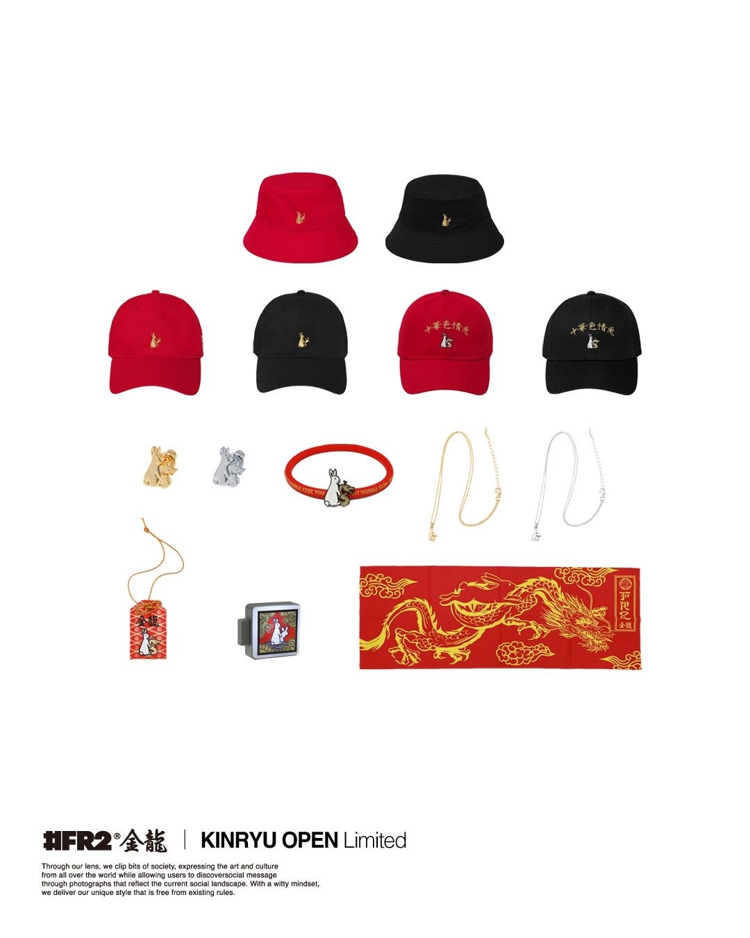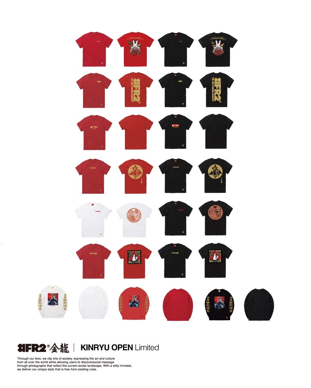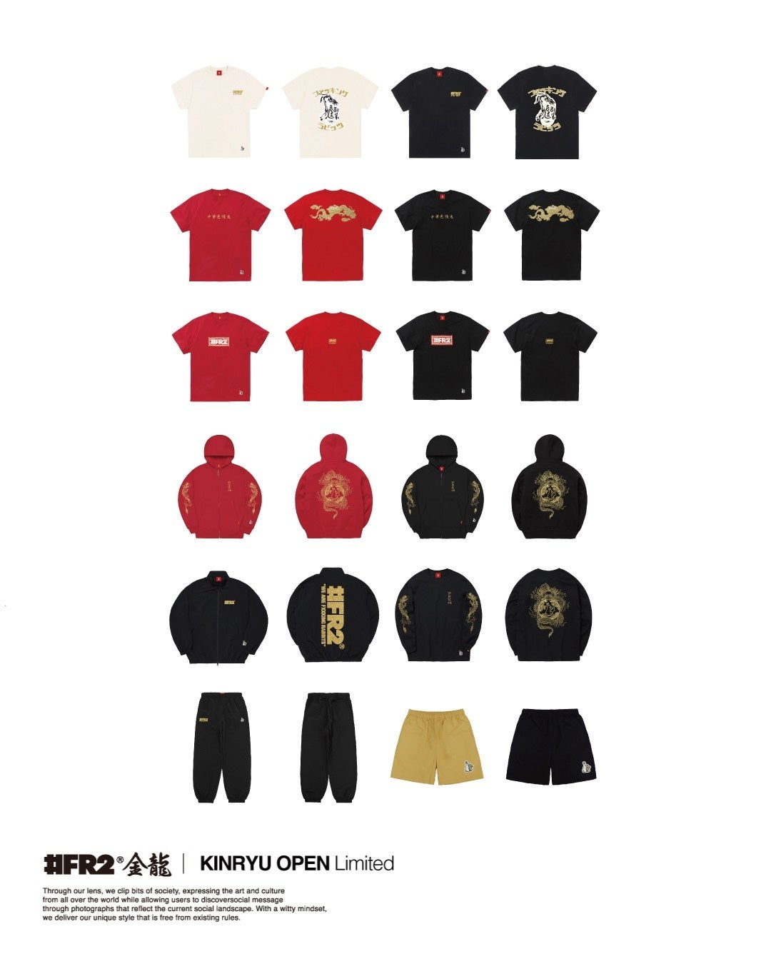 中華街というロケーションから着想を得て、赤や金を基調とした限定カラーを採用。「#FR2金龍」限定のグラフィックを落とし込んだアイテムに加え、#FR2の人気アーカイブデザインを「金龍」カラーでアップデートして限定販売いたします。