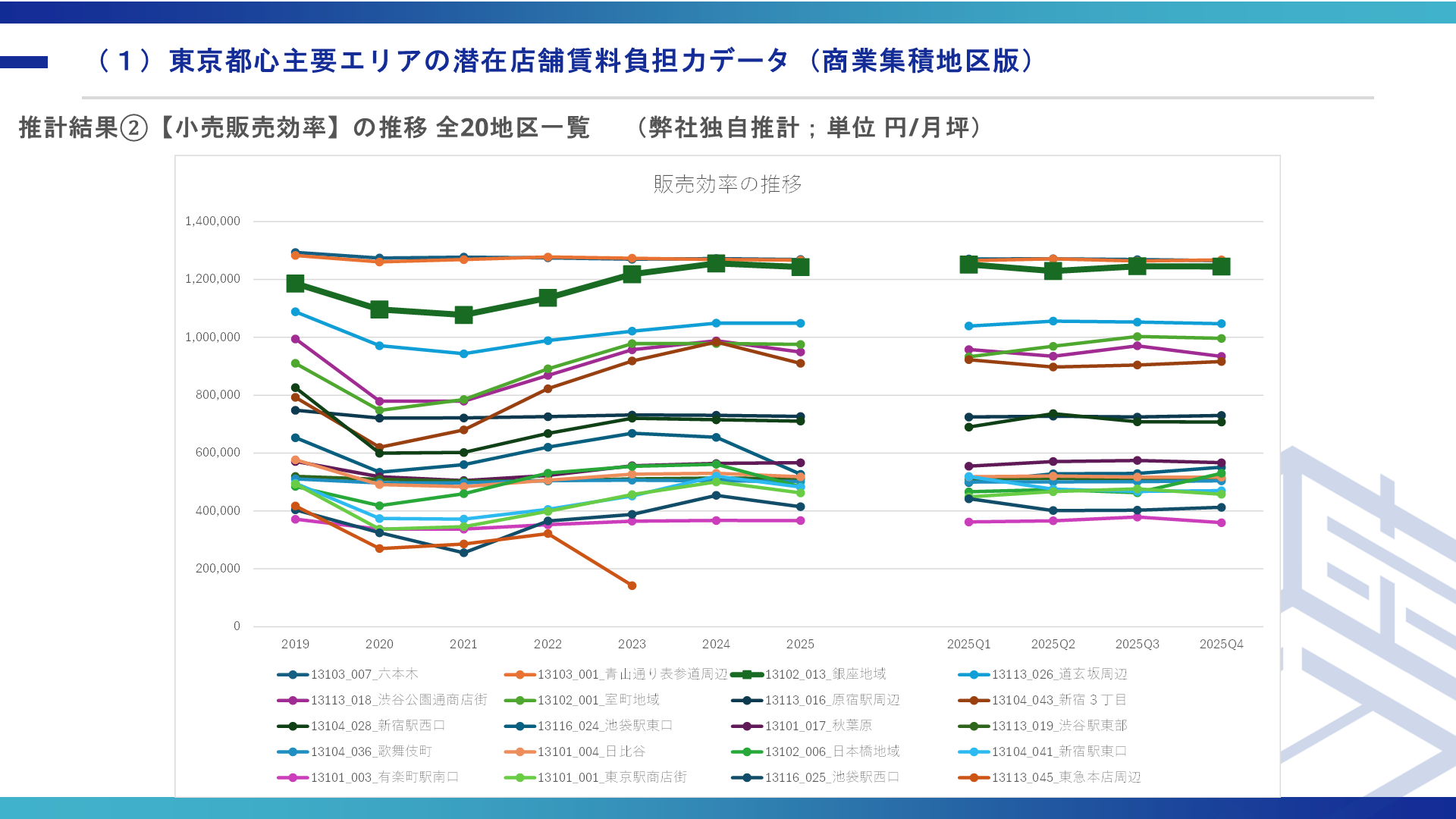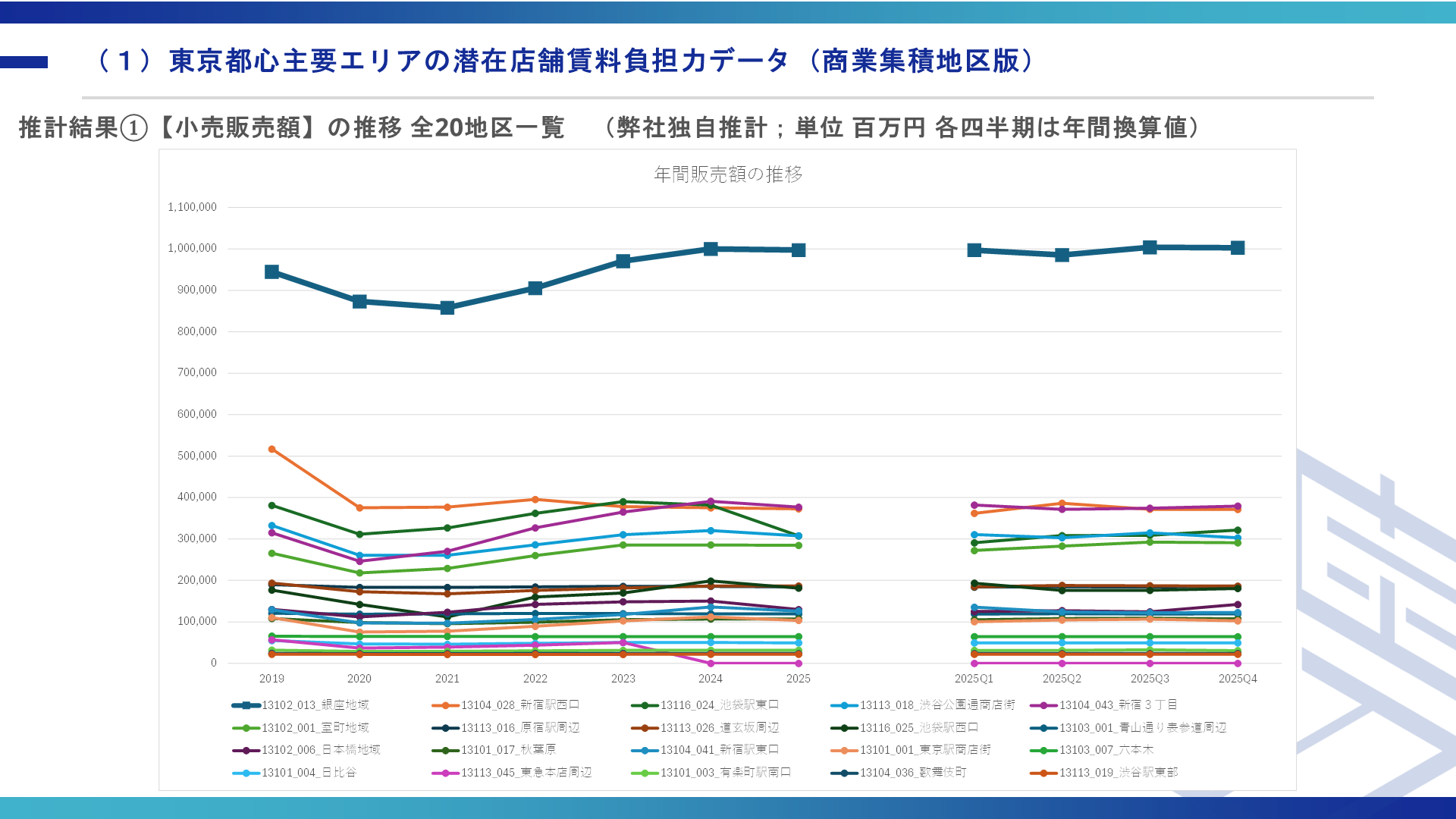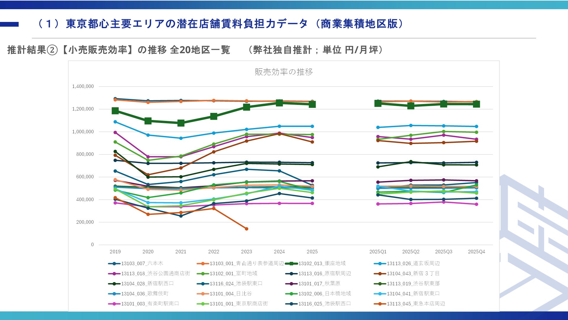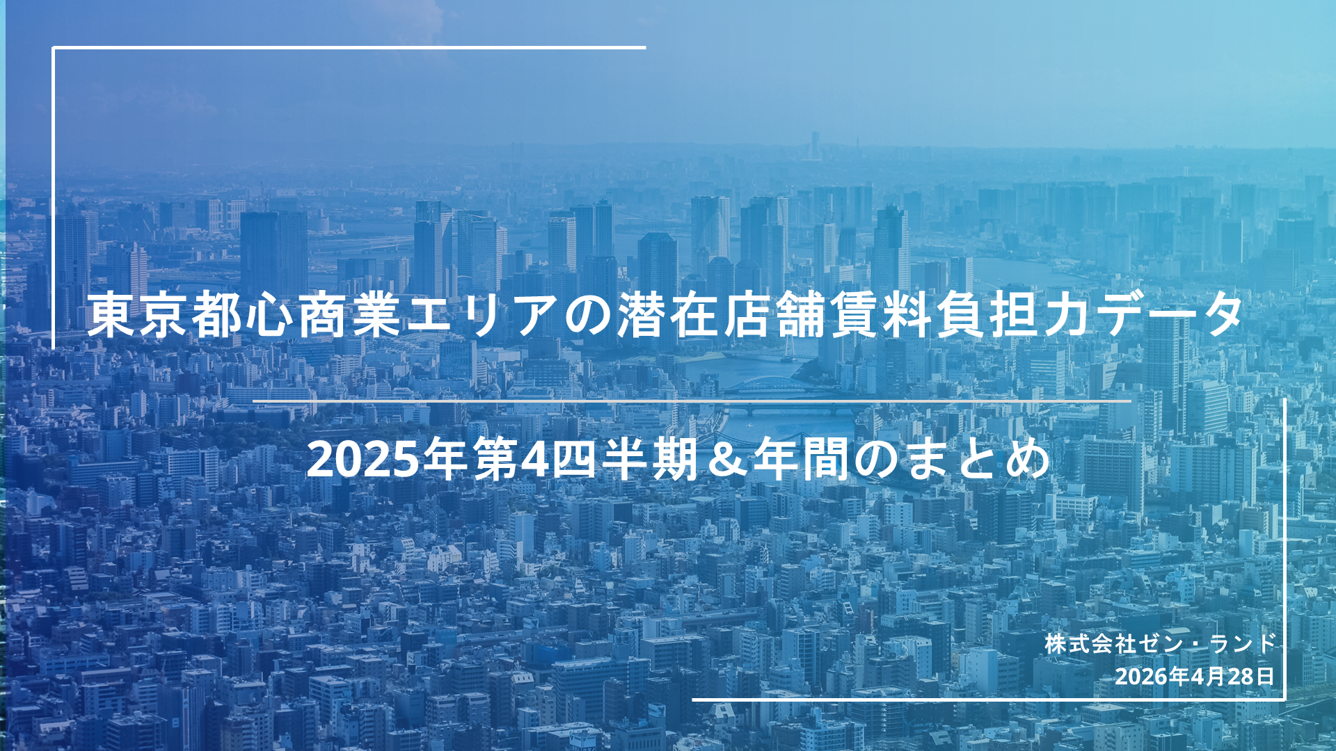 商業用不動産仲介事業を専門で取り扱っている株式会社ゼン・ランド(本社:東京都渋谷区、代表取締役社長 藤井善英、以下「当社」)は、人流データを活用し、東京都心主要6区(千代田区・中央区・港区・新宿区・渋谷区・豊島区)の商業集積地区20か所における小売販売額・販売効率の推移を推計した「東京都心商業エリアの潜在店舗賃料負担力データ 2025年第4四半期&年間まとめ」を公開いたしました。