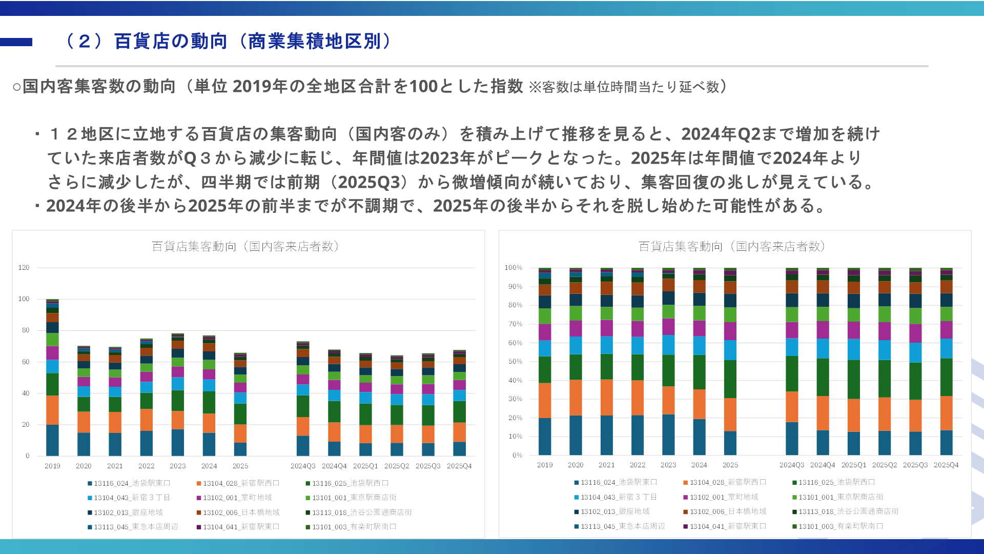 【販売額】20エリア合計の小売販売額は2025年もほぼ横ばいで推移。銀座・新宿駅西口・室町地域は安定を維持した一方、新宿3丁目(前年比▲3.6%)・渋谷公園通り商店街(▲3.9%)・池袋駅東口(▲19.5%)は減少。池袋駅東口は西武百貨店の営業規模縮小が主因だが、2025Q4では前期比+4.1%と回復の兆しが出始めた。
