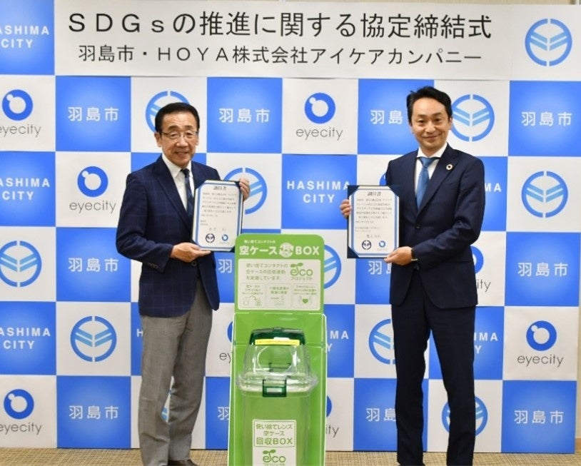 この協定内容は、HOYA株式会社 アイケアカンパニーが行う使い捨てコンタクトレンズ空ケース回収の取組について、岐阜県羽島市が情報発信・回収活動を行い、市民の皆さんに広くプラスチックごみ削減と資源再生の意識を啓発していくというものです。世界で広がっている持続可能な SDGs 社会の実現への取り組みに、当社少しでも貢献できるよう、これからも「アイシティ eco プロジェクト」を推進していきます。