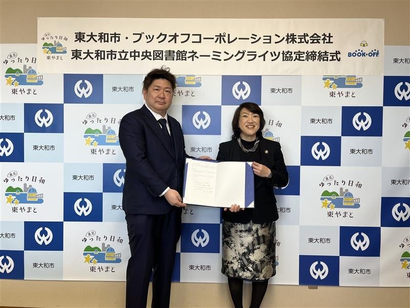 ブックオフグループホールディングス株式会社(本社:神奈川県相模原市、代表取締役社長:堀内康隆)の子会社で、リユースショップ「BOOKOFF」等を運営するブックオフコーポレーション株式会社(以下、ブックオフ)は、東大和市と、東大和市立中央図書館のネーミングライツ(施設命名権)取得に関する「東大和市立中央図書館ネーミングライツ協定書」(以下「本協定」)を締結し、2026年2月4日(水)に東大和市役所にて締結式を行いました。これにより、2026年4月1日から2031年3月31日までの5年間、東大和市の「東大和市立中央図書館」(以下「本施設」)の愛称は「BOOKOFF 東大和市中央図書館」(ぶっくおふ ひがしやまとしちゅうおうとしょかん)となります。