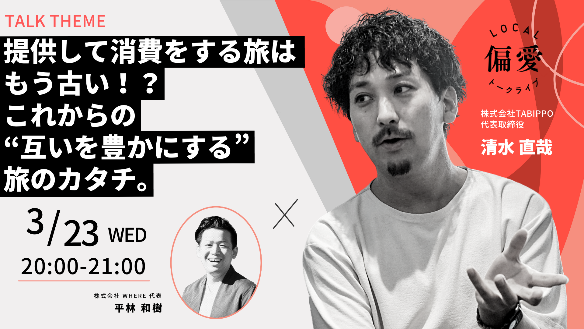 「旅で世界を、もっと素敵に」をビジョンに、これからの時代の多様な旅を提案する総合Webメディアを運営する株式会社TABIPPOの代表取締役・清水直哉さんをお招きし、オフレコありのトークライブを開催!
