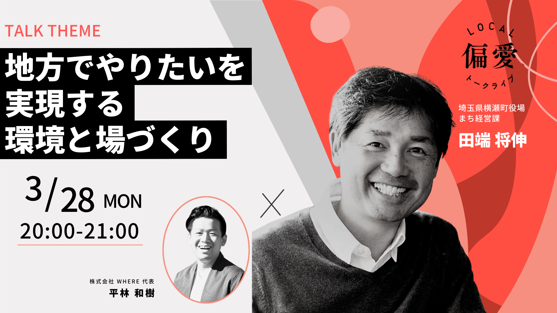 3月最後のトークライブを飾るのは、埼玉県横瀬町で、民間・団体等との新しい関係性を築くための仕組み、官民連携プラットフォーム「よこらぼ」や総合計画を担当し、「小さな町だからこそできることがある」を信条に活動をする、横瀬町役場の田端将伸さん!