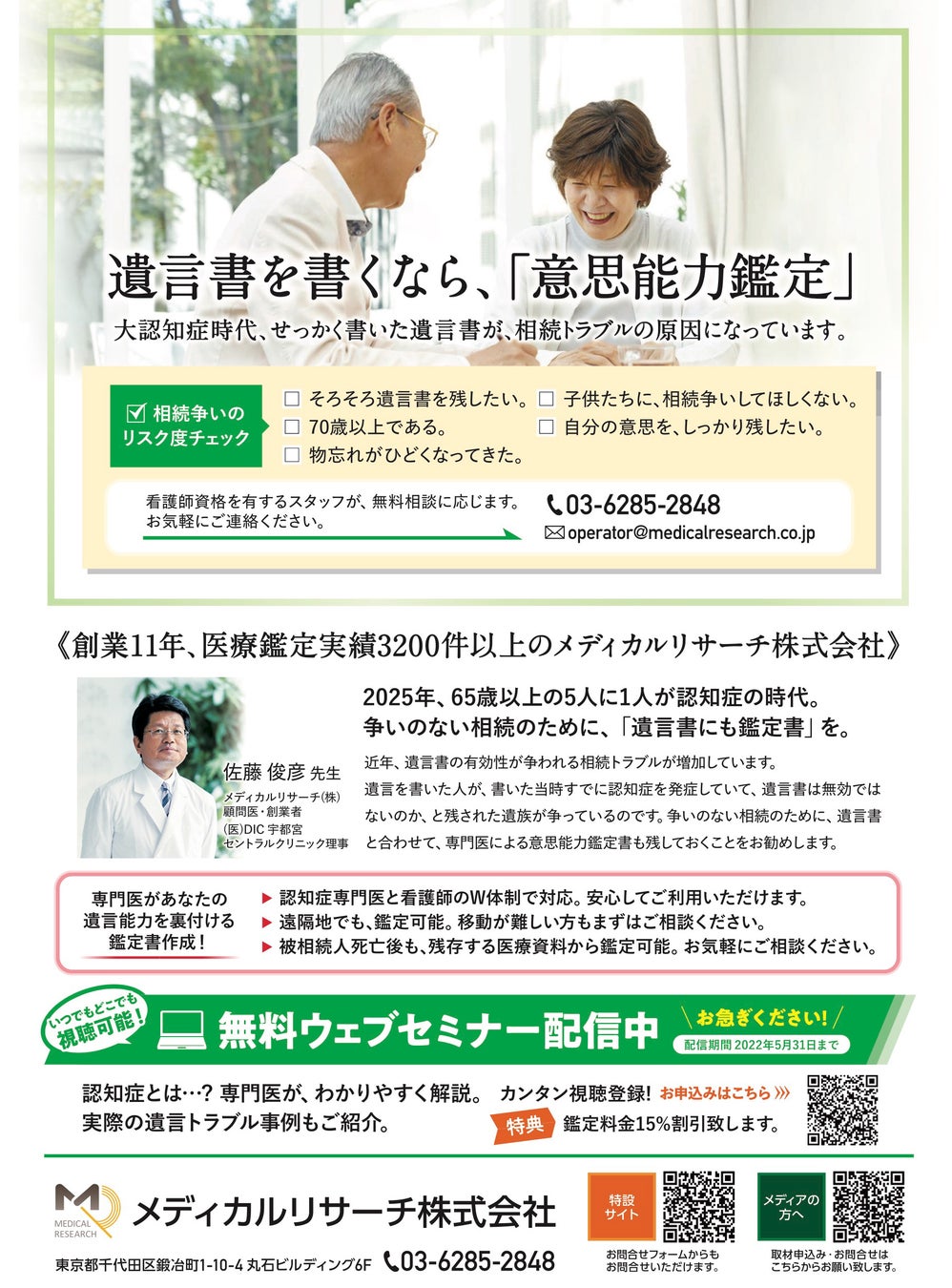 メディカルリサーチ株式会社 代表取締役 圓井 順子(本社:〒101-0044 東京都千代田区鍛冶町1-10-4 丸石ビルディング6階(https://www.medicalresearch.co.jp/)は、医療鑑定事業の一環として、遺言執行時の係争を未然に防ぐため意思能力®鑑定を行っています。