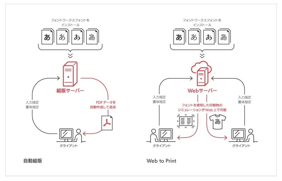 インターネット、LAN、その他ネットワークを通じてサーバーに接続したネットワーククライアントが、サーバー上のアプリケーションを介してフォントをご利用できます。フォントワークスフォントをお持ちでないネットワーククライアントにも、自動組版システムやWeb to printなどの各種サービスにて、高品質なフォントによる制作環境の実現が可能です。
