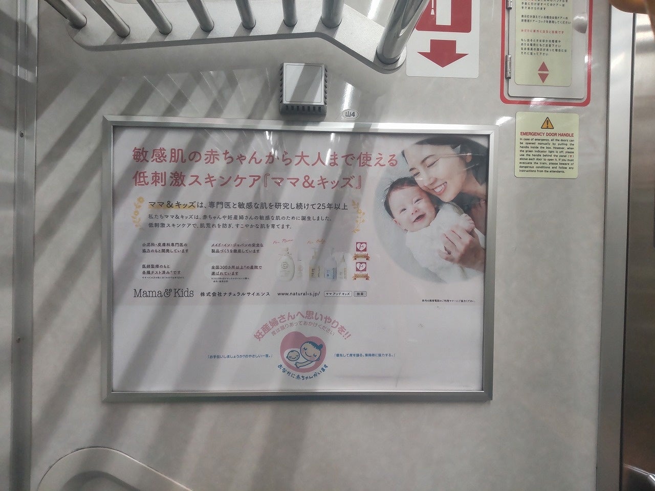 低刺激スキンケアメーカー、株式会社ナチュラルサイエンスがマタニティマークとタイアップした広告を都営新宿線、都営三田線、都営大江戸線の優先席エリアに掲出
