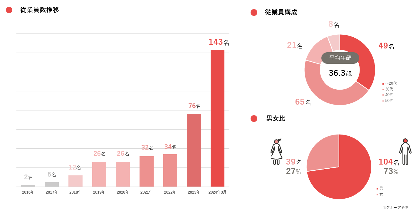 従業員数は2024年3月時点で143名と、事業の拡大とともに大幅に増加しています。基幹的農業従事者*2の平均年齢は68.4歳(2022年)、年齢構成では70歳以上の層が最大となる*3など、日本の農産業の高齢化は進んでいるなか、日本農業はグループ全体の平均年齢は36.3歳と、20~30代の従業員が多く活躍・チャレンジしているのも特徴です。