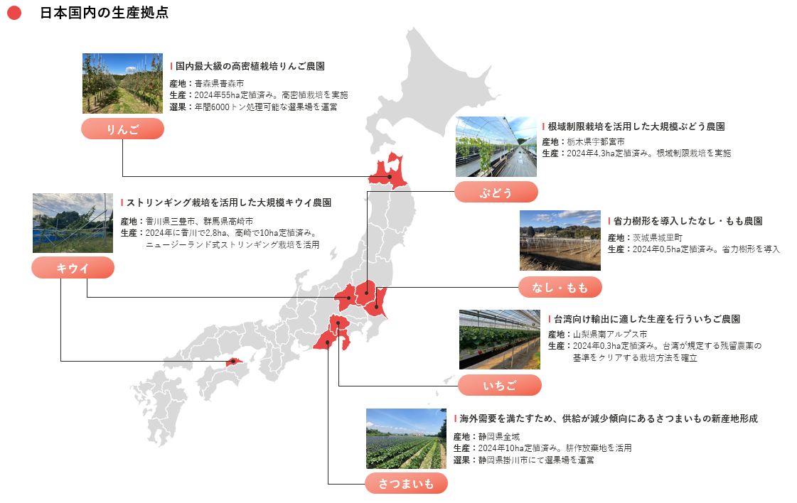 青森での高密植栽培*1を採用したりんごの生産、選果・梱包、アジア各国への輸出および日本全国の販売の経験を生かし、他品目・他産地への展開に取り組んでいます。現在では、さつまいも(静岡県)やぶどう(栃木県)、キウイ(香川県・群馬県)、いちご(山梨県)、なし(茨城県)、もも(茨城県)と他の品目や産地へと拡張しています。