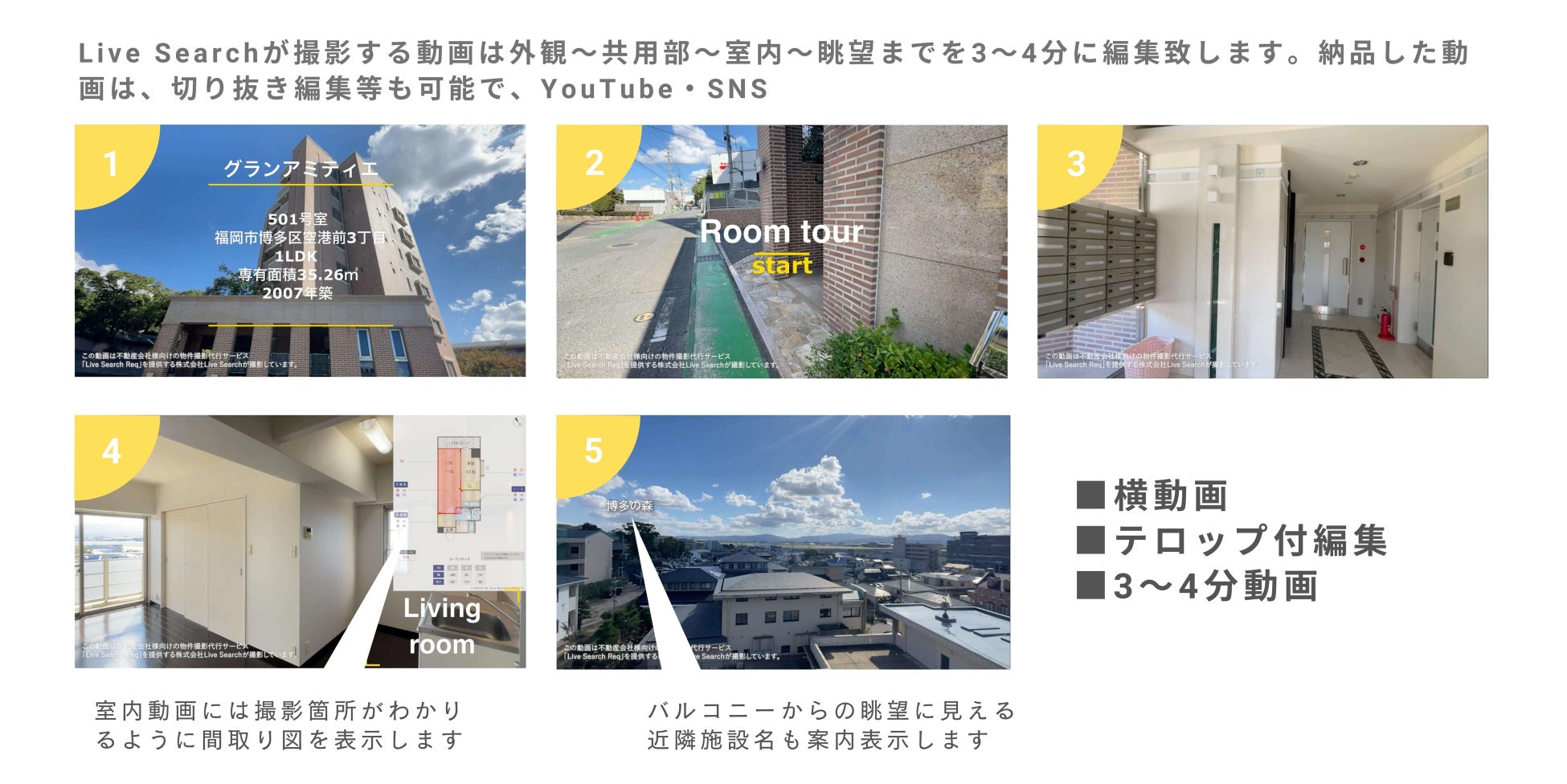 Live Searchでは、透明性が高く不安のない不動産情報発信のために、物件写真と正確な間取り図を提供しています。そこに加わる動画は、写真では把握しづらい「導線」や「広さ」などがよりリアルに伝わるように制作いたします。よって、物件の掲載や紹介時に動画だけではなく写真とセットでご活用いただくことで、お部屋探しユーザーの「ここが気になる」の解消をサポートします。