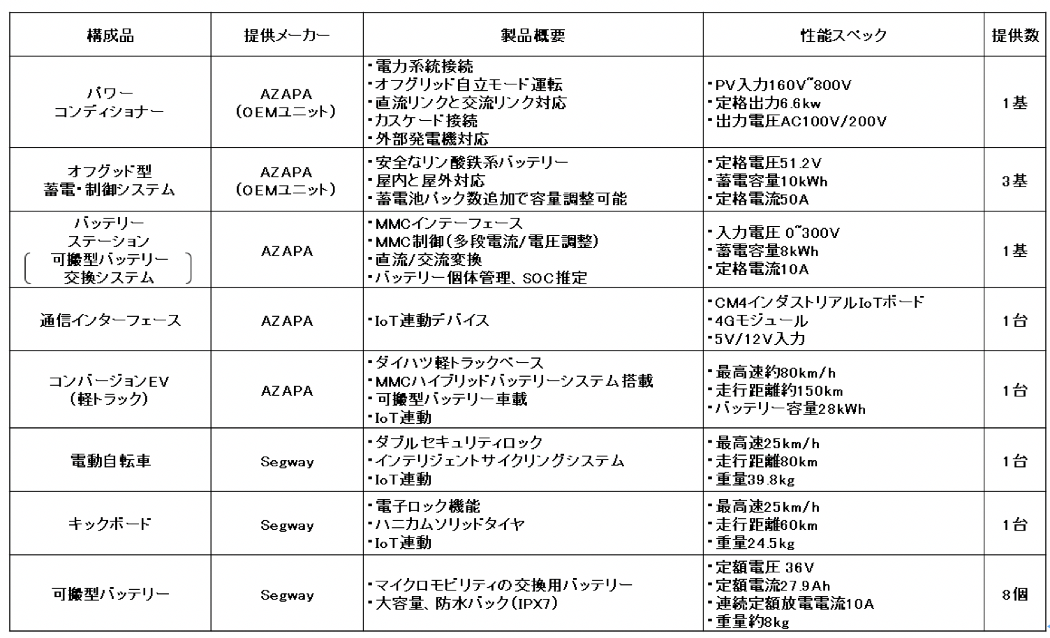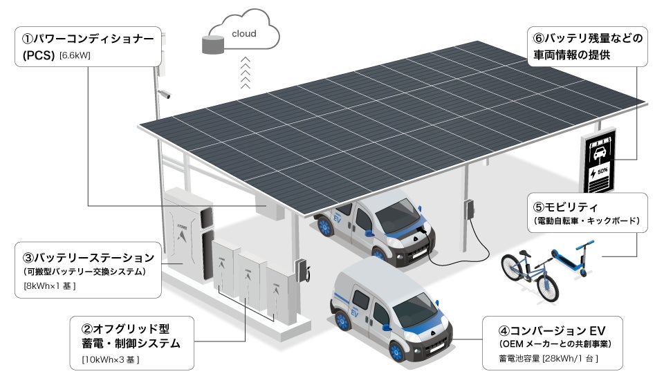 本実証事業は、電力系統から完全に分離・独立したソーラーカーポートと蓄電・制御システムを一体化した太陽光発電電力のみで運用するEVステーションにカーシェアリングサービスを組み合わせた取り組みで、AZAPAは、この取り組みに対し、パワーコンディショナーや蓄電・制御システムなどの基盤に加え、バッテリーステーション(可搬型バッテリー交換システム)、可搬式バッテリーで動くコンバージョンEV(OEMメーカーとの共創事業)およびモビリティを提供します。