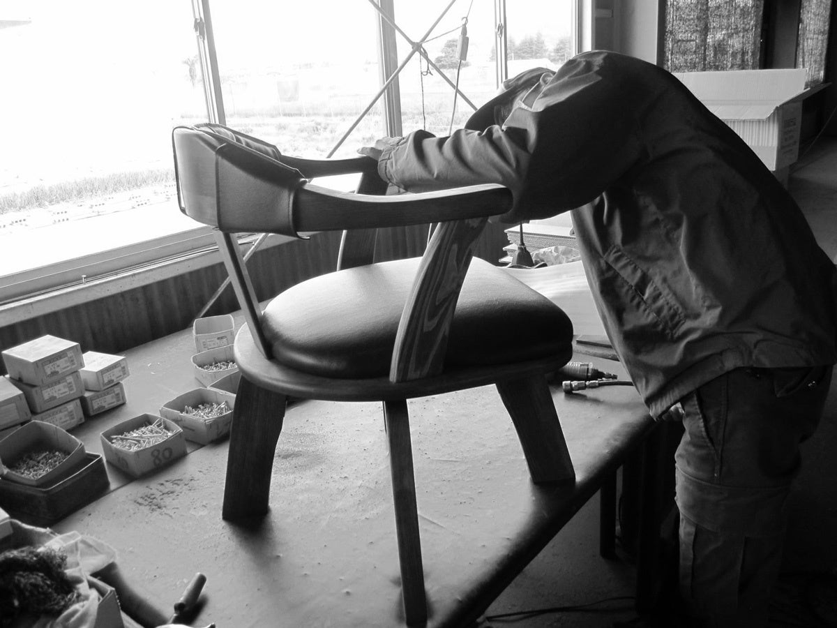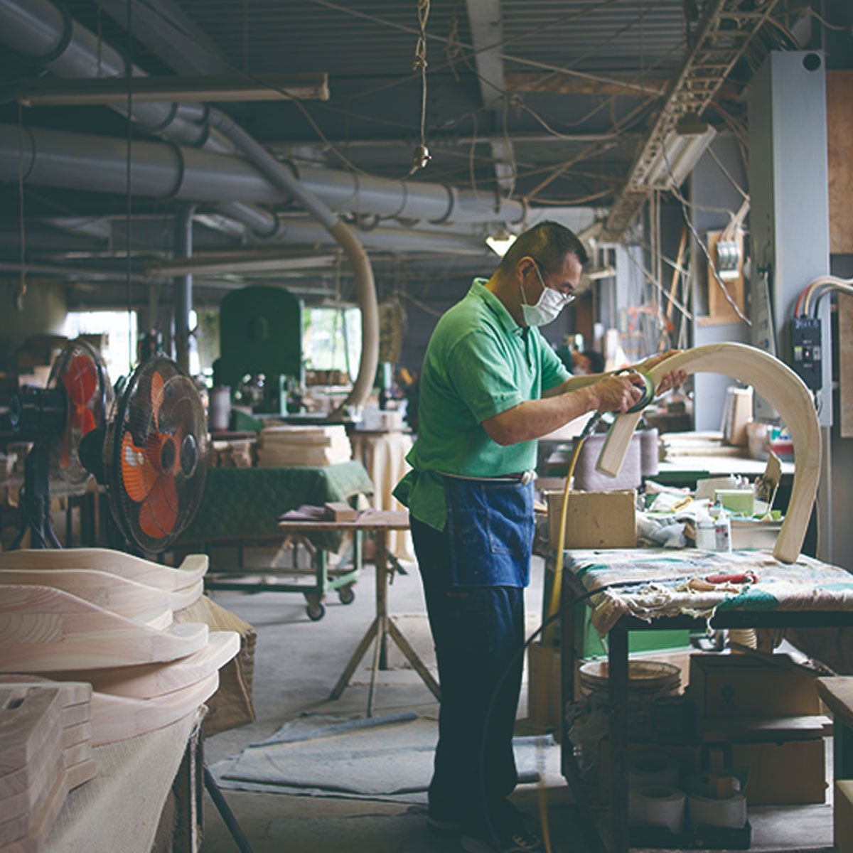 福岡県広川町の工場で熟練職人が一つひとつ手作業で制作。繊細なカーブや肘掛け周りの滑らかな仕上げにより、手触りの良さと座り心地を実現しました。