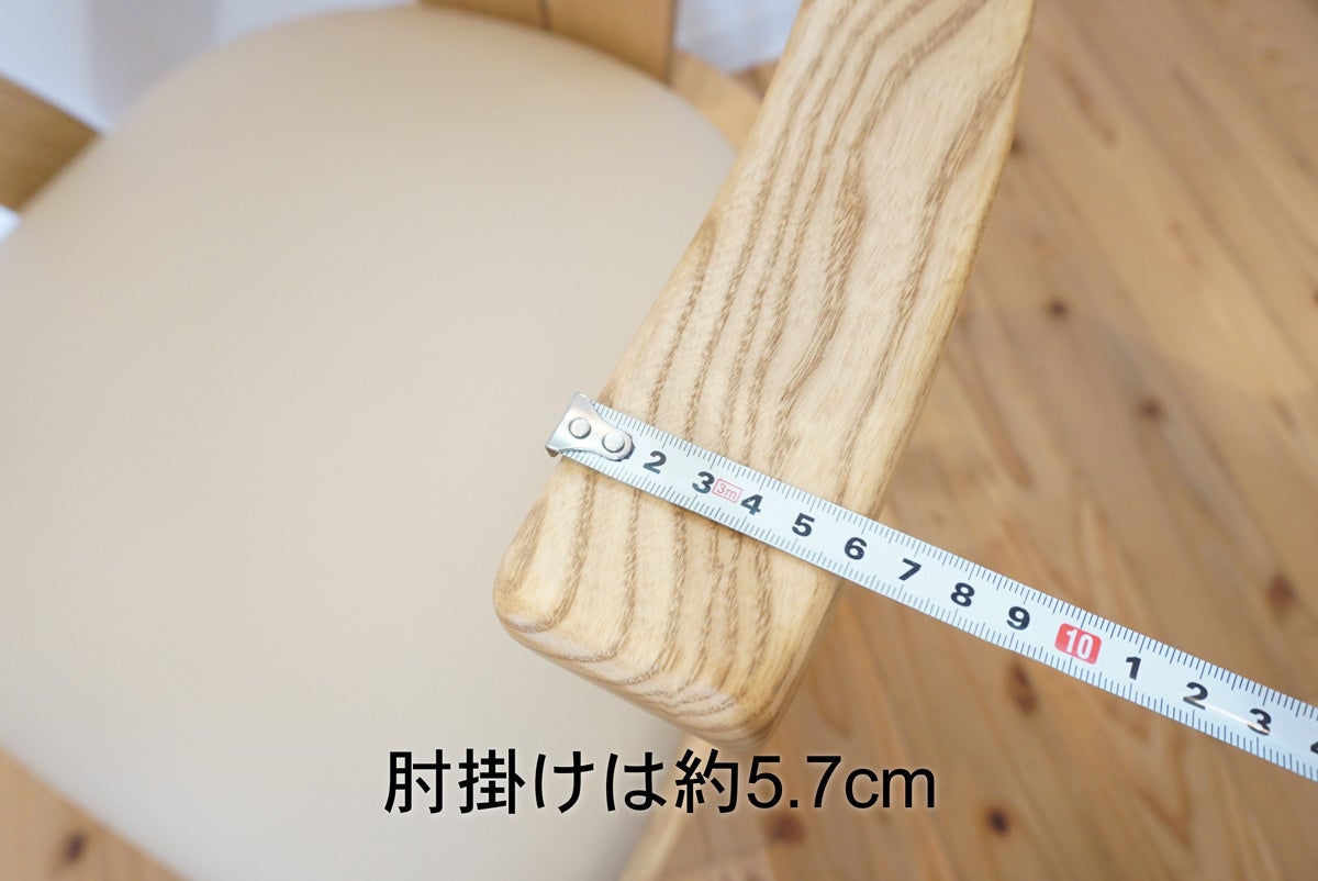 アッシュ無垢材のどっしりとした木部デザインは、相撲部屋でも使用実績がある強度を誇ります。肘掛け部分は約5.7cm幅の厚みがあり、しっかり握れる設計です。天然素材ならではの木目の個性が、インテリアに高級感を加えます。