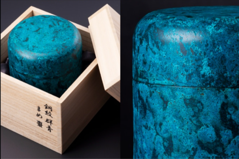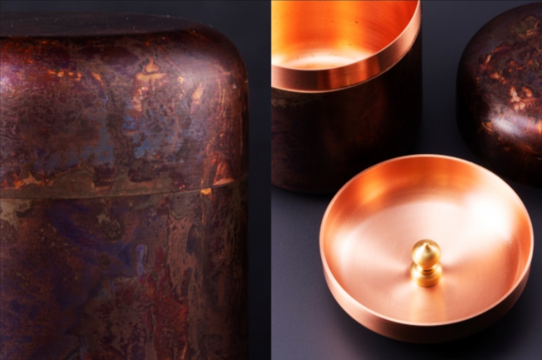 一枚の金属板を伸ばし、絞り出すように成型する技法《へら絞り》により本体を銅にて成型します。着色は銅の腐食性を利用し、薬品や炎をコントロールしながら鮮やかな色彩を発色させる技法を採用しました。ひとつひとつが職人技による手作りのため、サイズも発色も微細に異なった仕上がりです。「棗(なつめ)」とは、本来抹茶を入れておく容器のことで、その形状がナツメの実に似ていることに由来します。「まめ棗」はナッツを入れる容器であること、茶器のように伝統工芸を駆使して作ったことから命名しています。