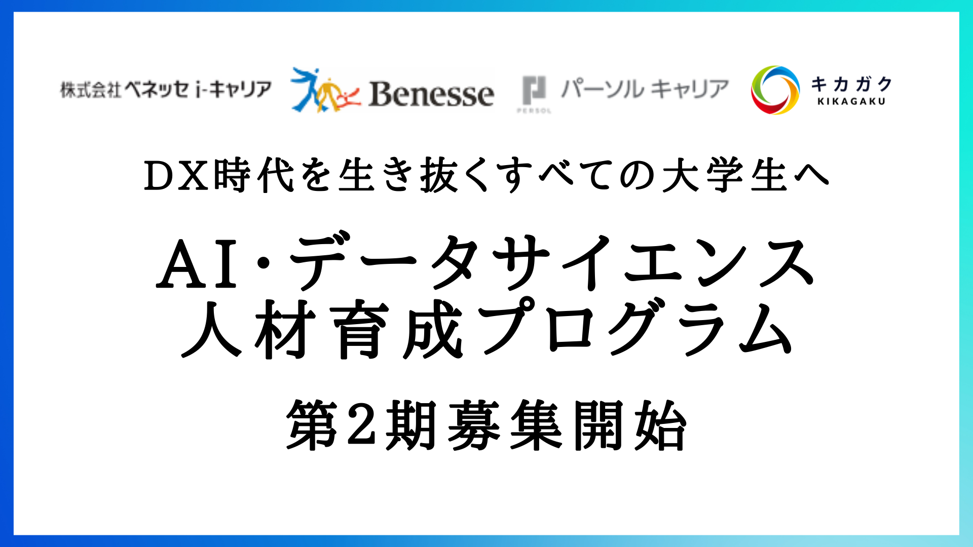 人工知能 ( AI ) 領域を含めた先端技術に関する教育事業を展開する株式会社キカガク(本社:東京都渋谷区、代表取締役 大崎 将寛)は株式会社ベネッセホールディングスとパーソルキャリア株式会社の合弁会社:株式会社ベネッセi-キャリア(本社:東京都新宿区、代表取締役社長:原野 司郎)が運営する、成長支援型逆求人就活サービス「doda キャンパス」と、3 月 10 日(木)より、大学生向けに「AI・データサイエンス人材育成プログラム by doda キャンパスゼミ」を開始するとともに、参加学生・企業を募集いたします。募集期間は 3 月 10 日(木)~ 4 月 3 日(日)です。